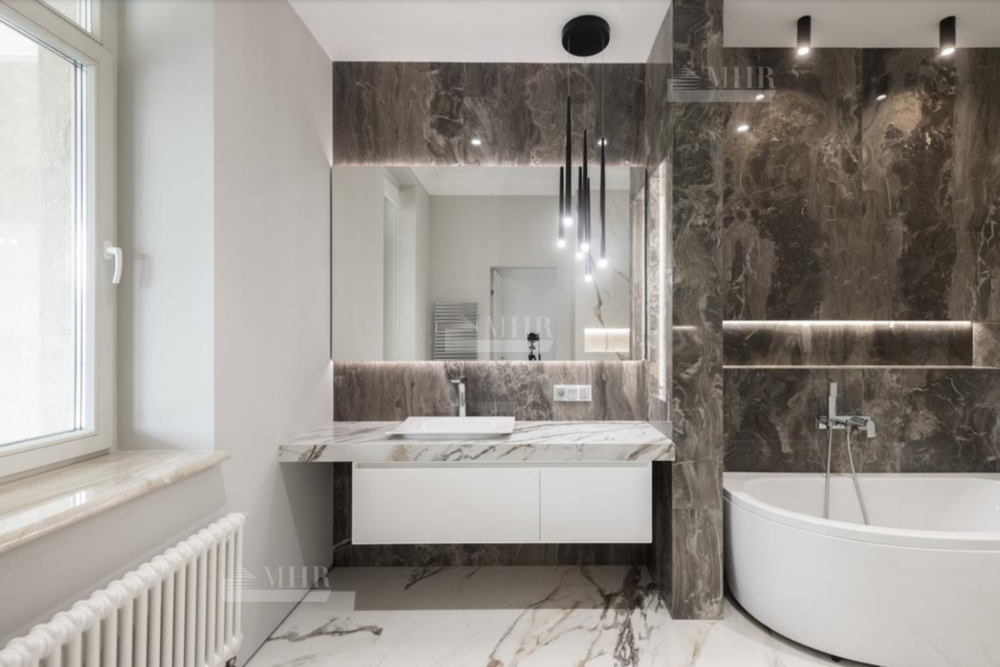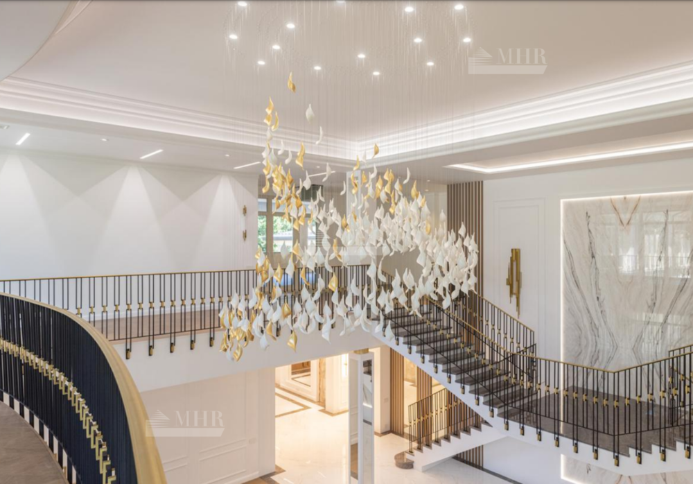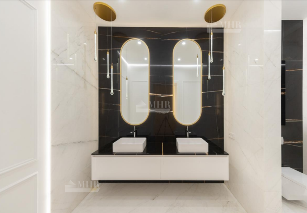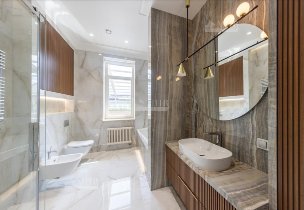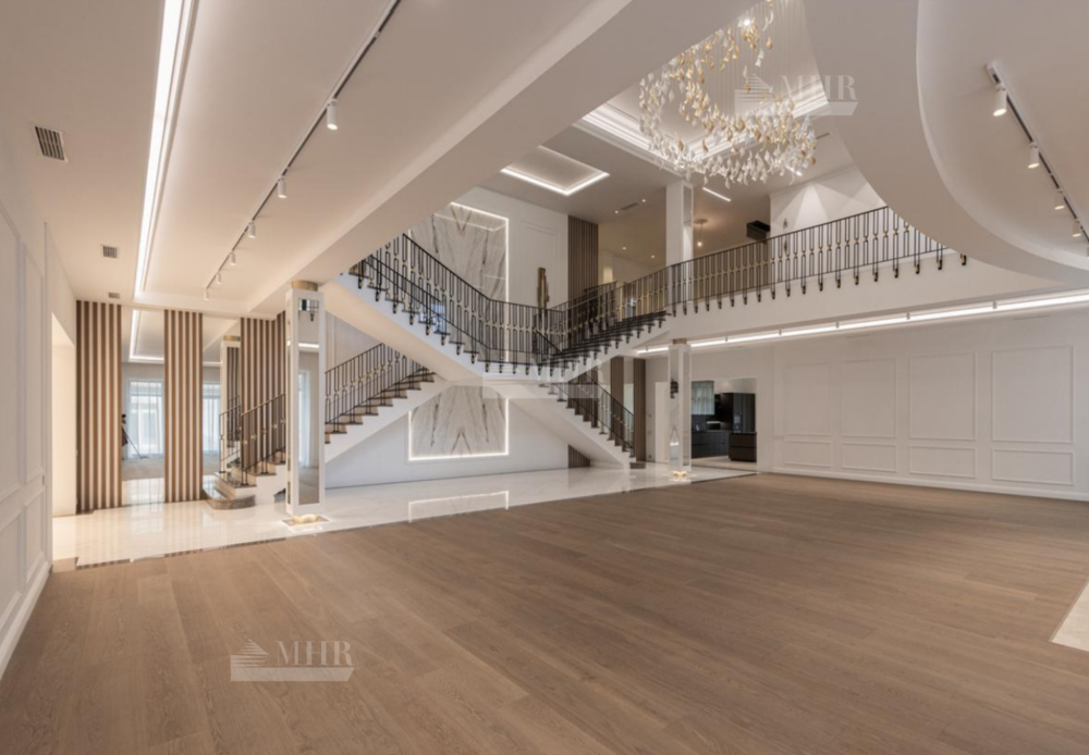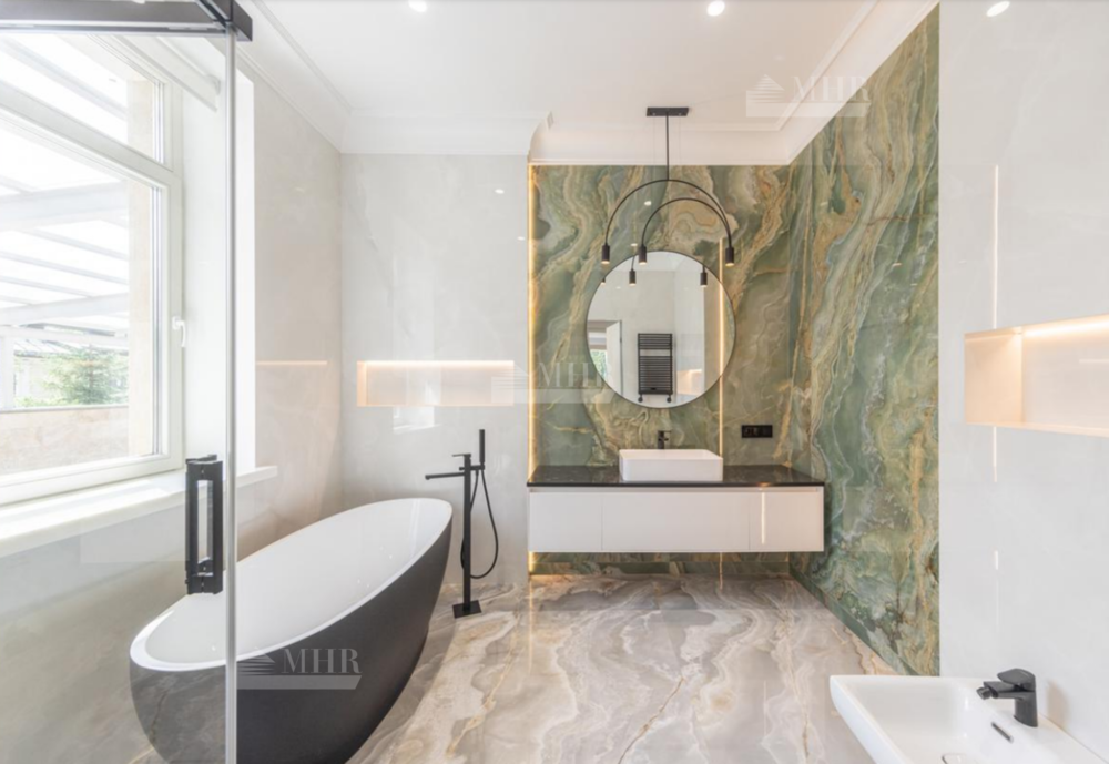 Великолепный каминный зал и хозяйская кухня-столовая идеально подходят для семейных ужинов и торжественных приемов. Так в доме танцевальный зал и SPA-зона с 23-метровым бассейном. В хозяйственном блоке есть все необходимое для удобства, а кабинет с камином и выходом на террасу станет любимым местом для работы и отдыха. Гостевая часть дома оборудована кухней и спальнями, обеспечивая комфортное проживание гостей. На цокольном этаже расположены спортивный зал, душевая, котельная, сауна, хаммам, санузел, гардеробная и дополнительные душевые. Отделка в доме произведена высококачественными материалами. Кухня представлена брендом Scavolini, бытовая техника — от Küppersbsuch. Простор и свет пронизывают каждый уголок дома, а функционально удобная планировка предусматривает комфортное проживание для большой семьи.