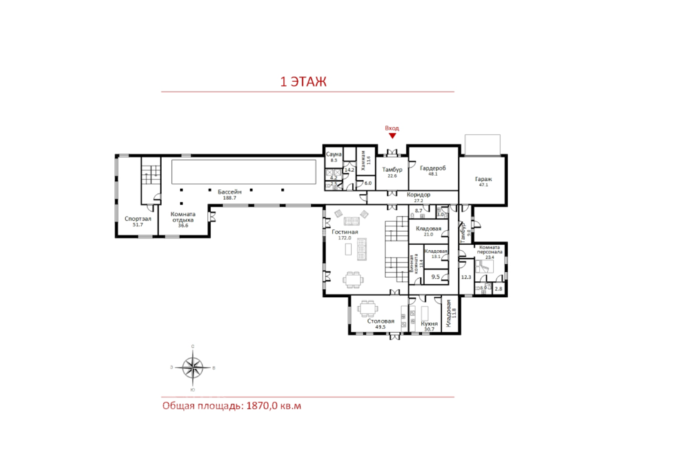 1 этаж: холл, большая гардеробная, с/у, каминный зал (175 кв.м.), хозяйская кухня-столовая, рабочая кухня и кладовая при кухне, зона спа: бассейн 23 метра, сауна, хамам, раздевалка, с/у, душевая, комната отдыха, танцевальный зал (зал для йоги), хозяйственный блок: серверная, гараж на 2 м/м, спальня с с/у и гардеробной для персонала, кладовая большая, постирочная, гладильная, комната свободного назначения;