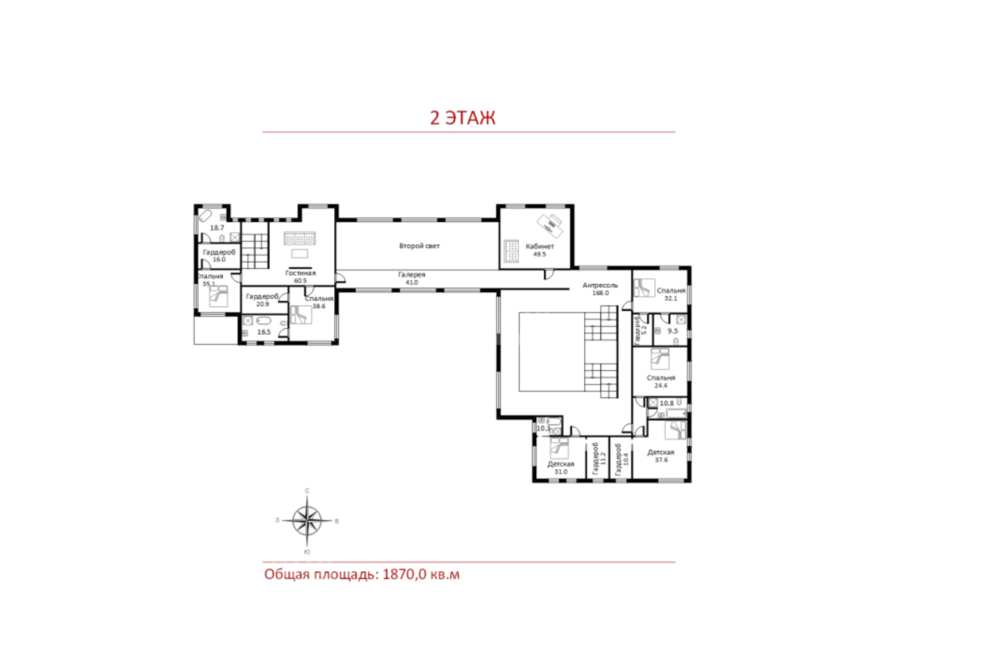2 этаж: гостевая спальня с с/у и гардеробной с выходом на большую крытую террасу, спальный блок: спальня с с/у и гардеробной, с/у, спальня с выходом на просторную террасу, спальня с с/у и гардеробной и своим балконом, кабинет с камином и выходом на террасу, гостевая часть дома: кухня, спальня с с/у и гардеробной, спальня с с/у и гардеробной.