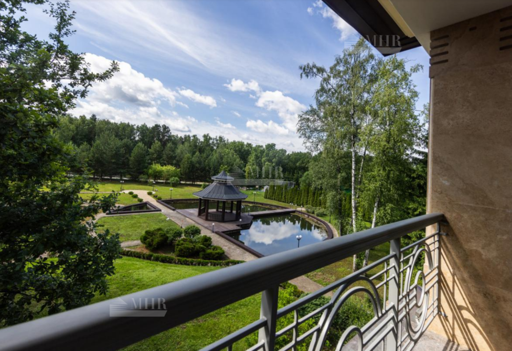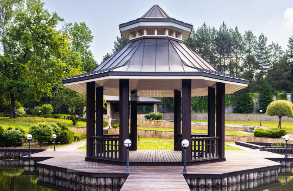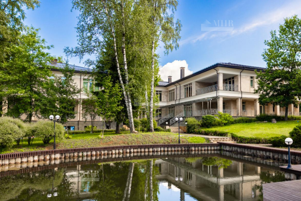 На участке беседка-барбекю, гараж, также блок для персонала: кухня-гостиная, с/у, спальня, гардеробная, спальня, с/у, гардеробная, спальня. На территории участка расположен живописный пруд с биоотчисткой, течетбискусственный ручей.