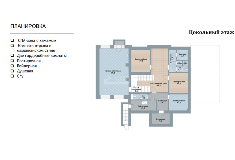 цоколь: СПА-зона с хамамом, комната отдыха в марокканском стиле, две гардеробные комнаты, постирочная, бойлерная, душевая, с/у;