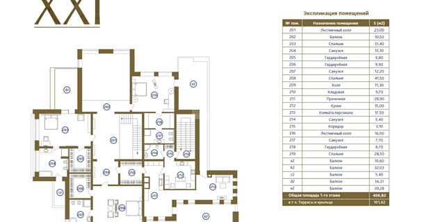 1 этаж: прихожая, гостиная, кухня-столовая, с/у, блок для персонала, с/у, террасы;