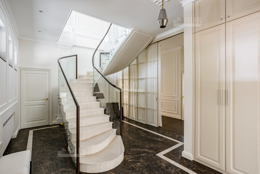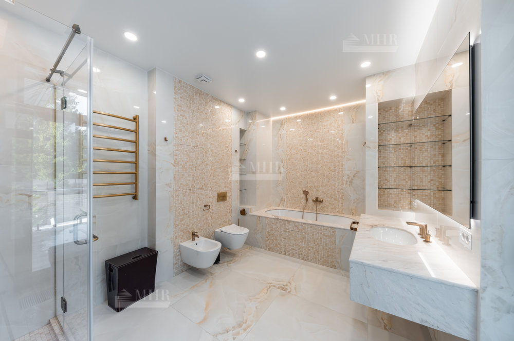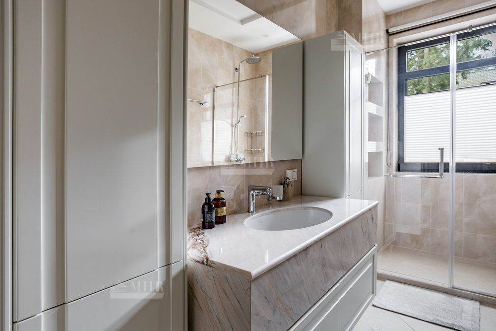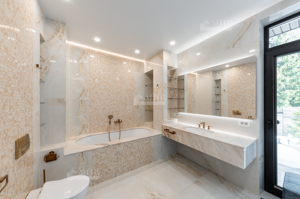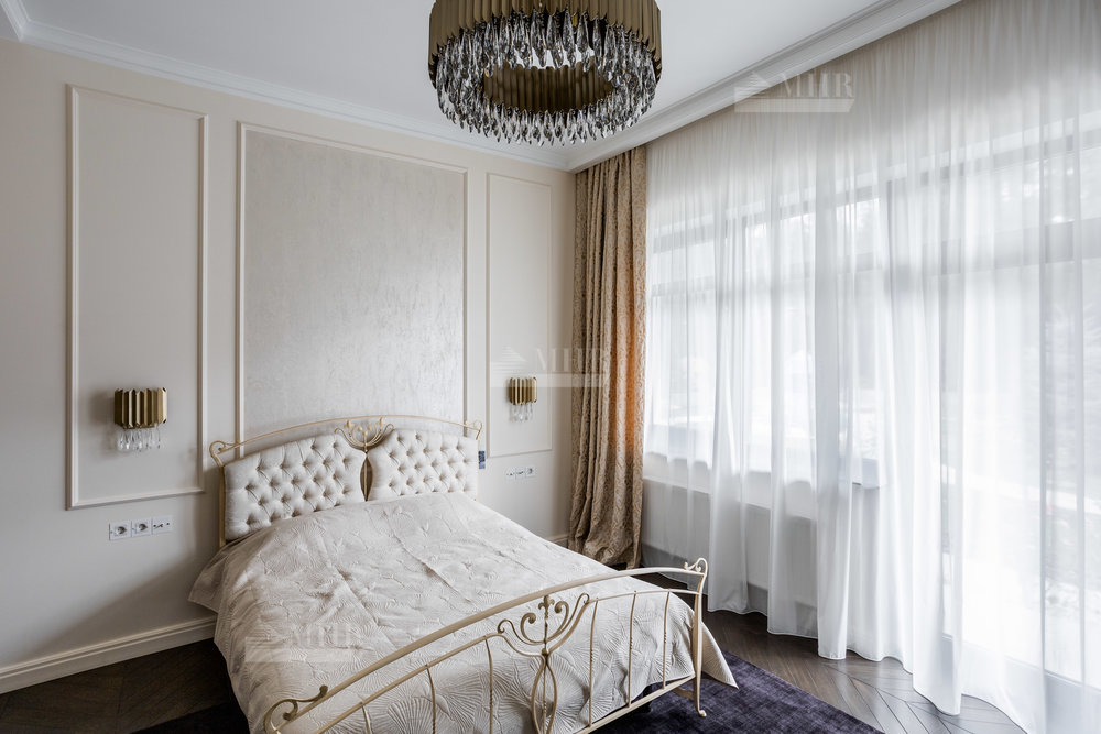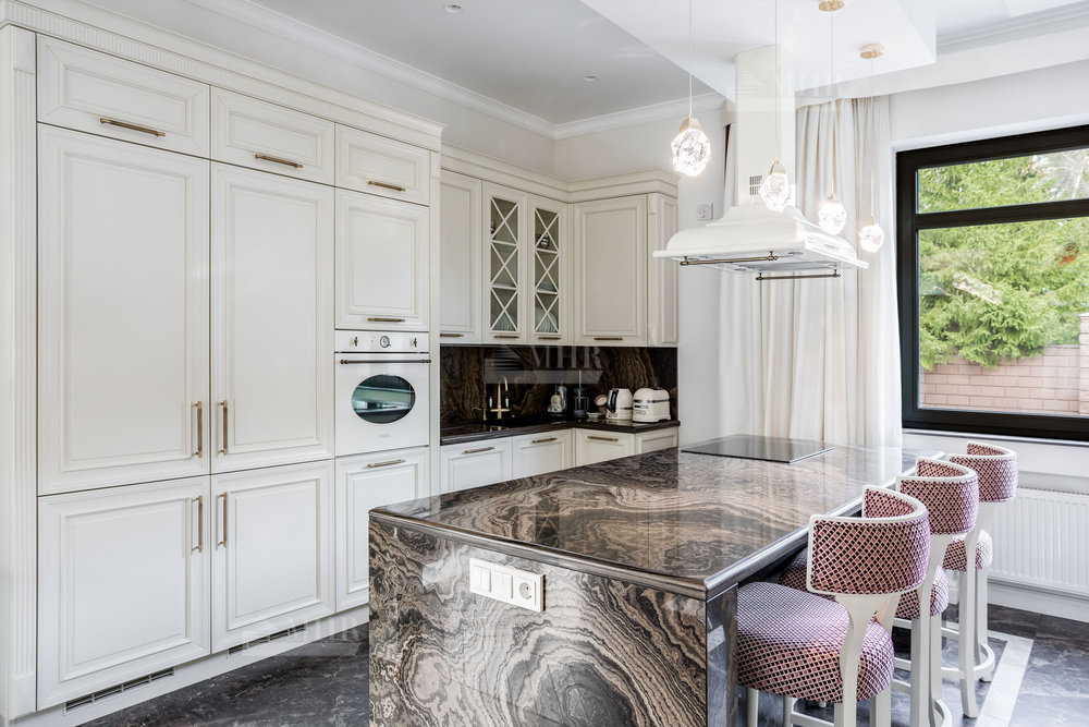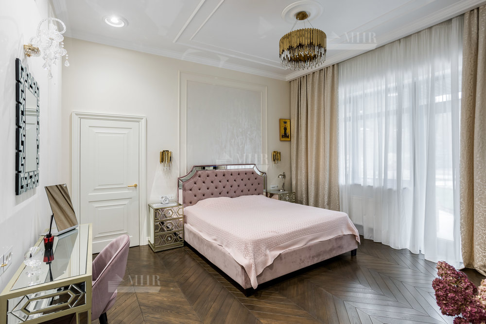 Интерьер выполнен из натуральных дорогостоящих материалов, установлена сантехника Villeroy&Boch, межкомнатные двери Union, кухня и гардеробные от компании Verona mobili, кондиционирование Daikin, окна Shuko. На первом этаже 2 спальни!