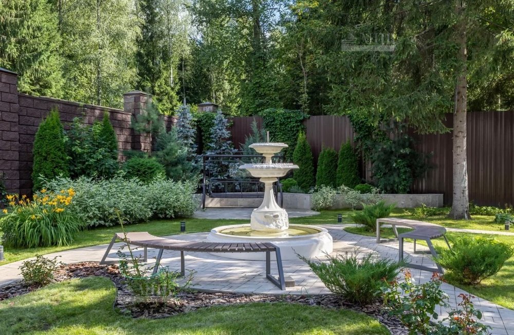 На участке выполнен прекрасный ландшафтный дизайн- взрослые деревья, декоративные кустарники, розарий, а в центре зоны отдыха расположен красивый фонтан.