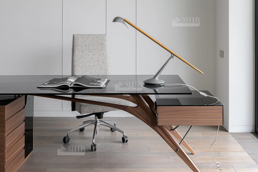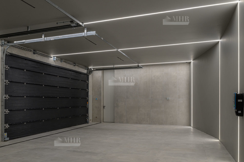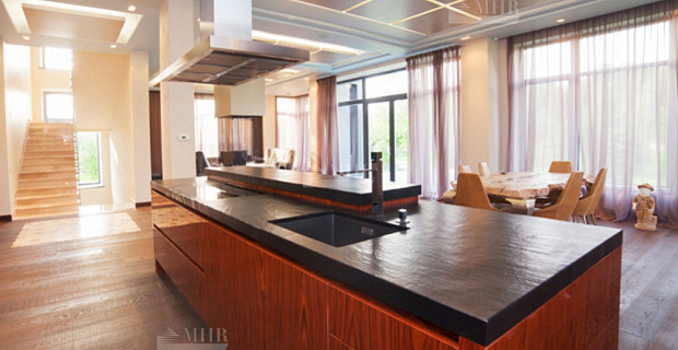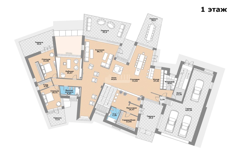 1-й этаж: прихожая с гардеробной, кухня с кладовой для продуктов, столовая с выходом на террасу, готиная с выходом на террасу, 2 холла, кабинет, спальня с гардеробной и выходом на террасу, спальня с террасой, ванная комната, гараж;