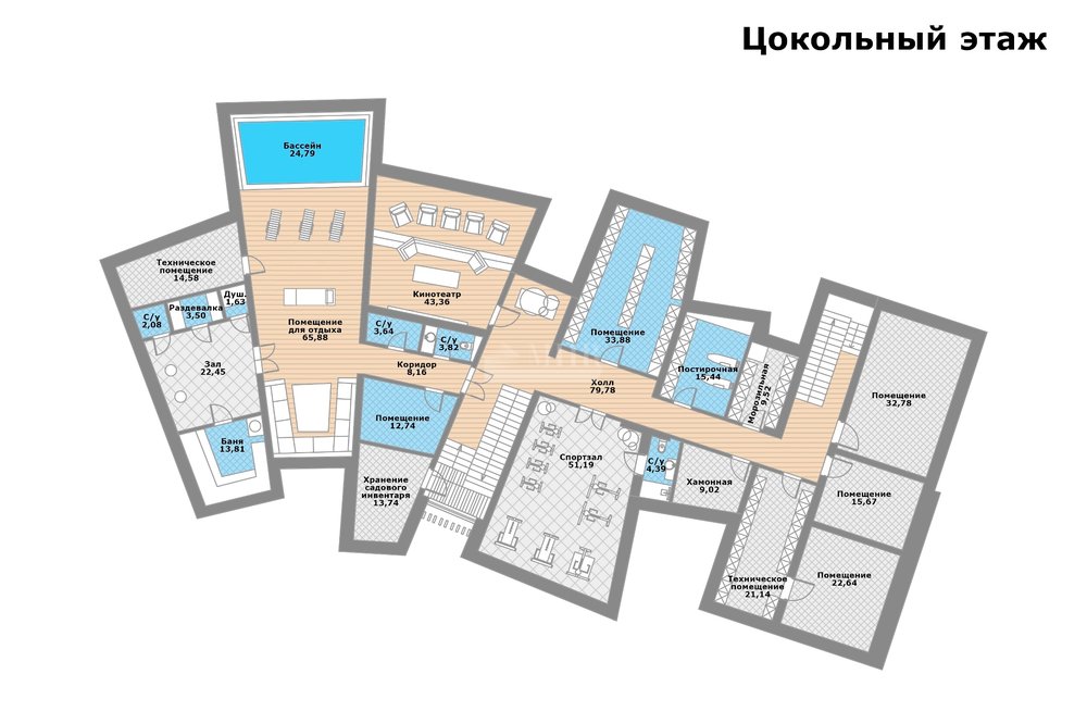 Цокольный этаж: СПА-комплекс-бассейн, помещение для отдыха, сауна, зона отдыха, раздевалка, душ, с/у, помещения свободного назначения, кинотеатр, спортзал с с/у, постирочная, морозильная камера, помещение свободного назначения, технические помещения, хранение садового инвентаря.