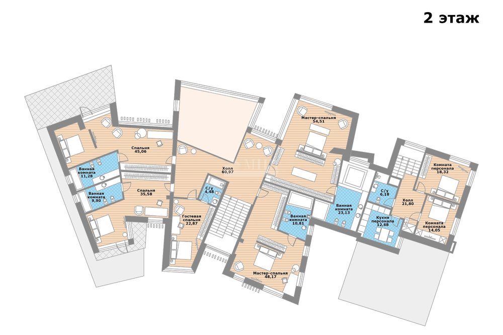 2-й этаж: мастер-спальня с ванной комнатой, мастер-спальня с ванной комнатой, 2 спальни с ванной комнатой, гостевая спальня с с/у, лестничный холл; блок персонала.