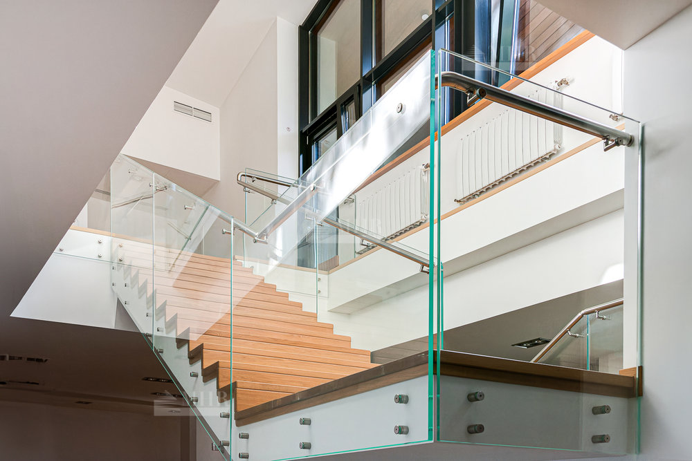 Перепад рельефа повторен в интерьере, концепцию которого архитекторы характеризуют как «перетекающее пространство». Эта формулировка описывает взаимосвязь рельефа с объемами, фасадами, и интерьерами здания – деревянная отделка полов частично переходит на стены и потолки, рассекая белый монолит периметра параллельно плоскостям фасада. Дополненная стеклянными и зеркальными поверхностями, она формирует сложное, развитое пространство, которое дополнено объектами, созданными специально для негоНа участке растут хвойных деревьев, вековые липы и расположен навес на 2 машины.