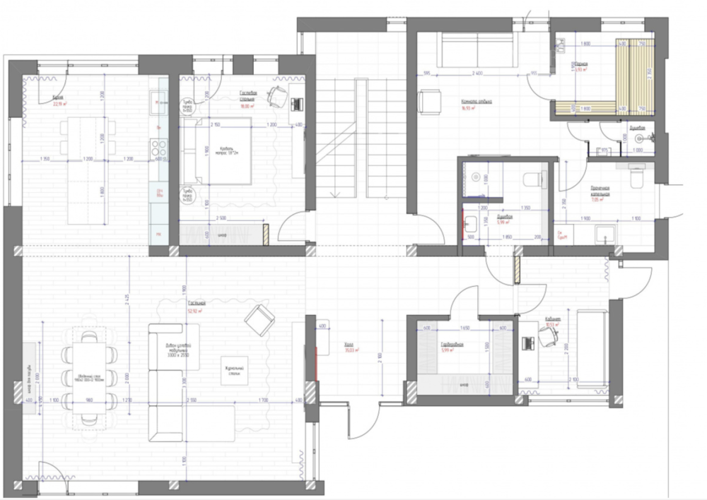 1-й этаж: прихожая, холл, гардеробная, с/у, кухня, кабинет, спальня, комната отдыха, душевая, сауна, постирочная;