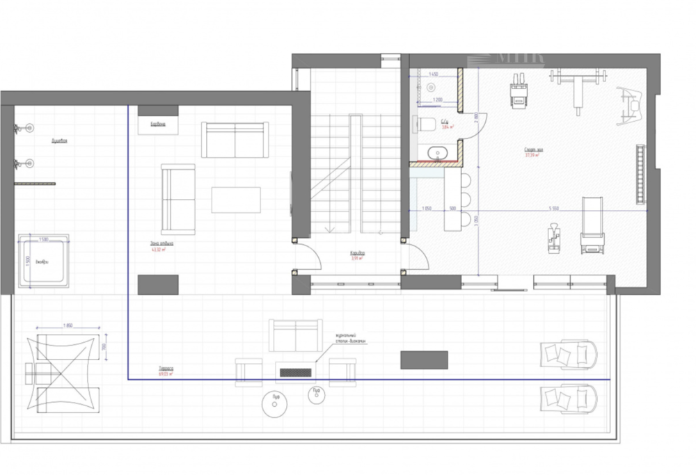 3-й этаж: тренажерный зал, комната отдыха, душевая.
