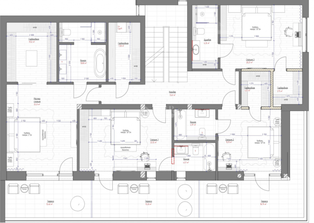 2-й этаж: холл, мастер-спальня с с/у и гардеробной, балкон, спальня с с/у-2 шт., детская игровая, кладовая.