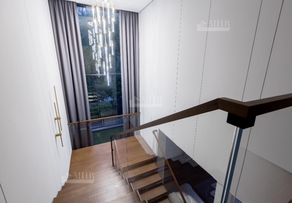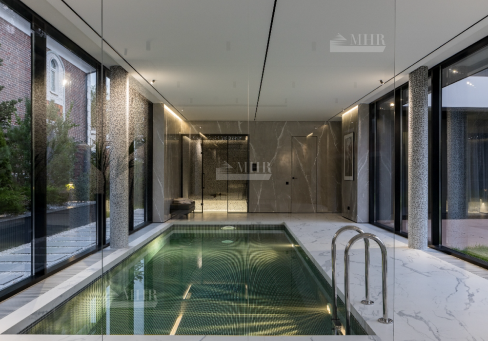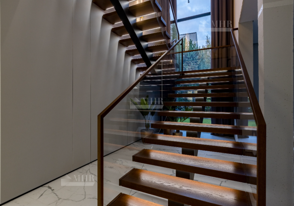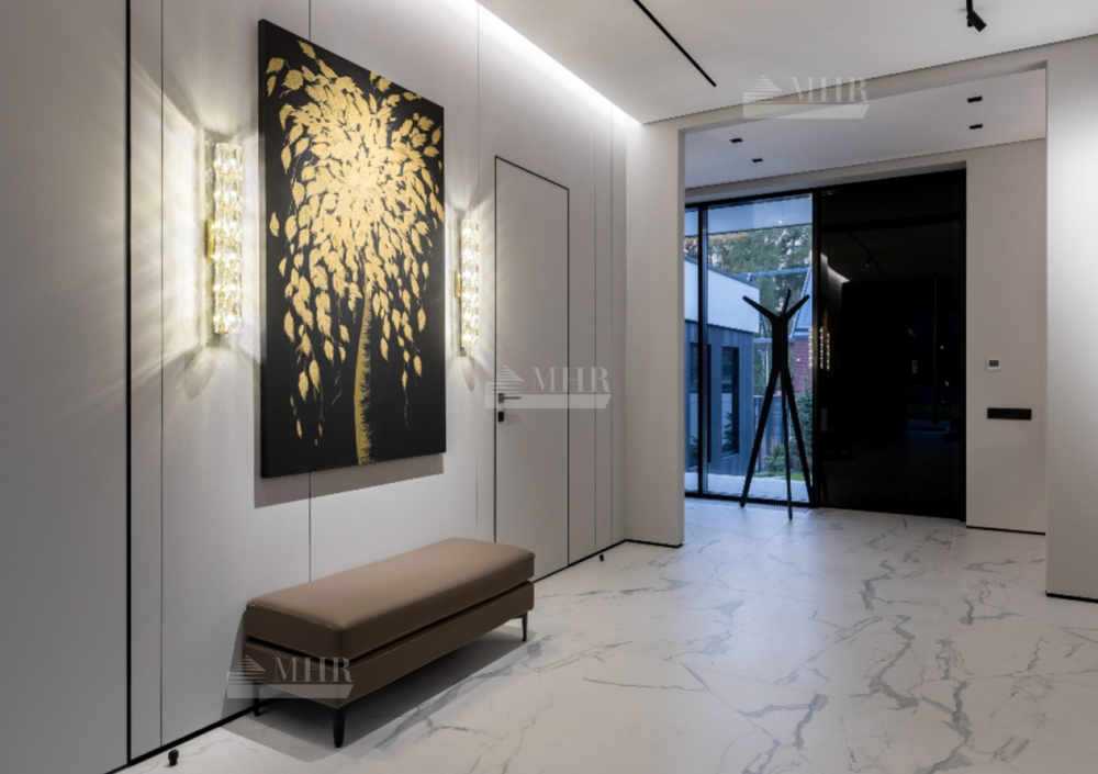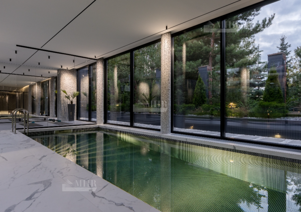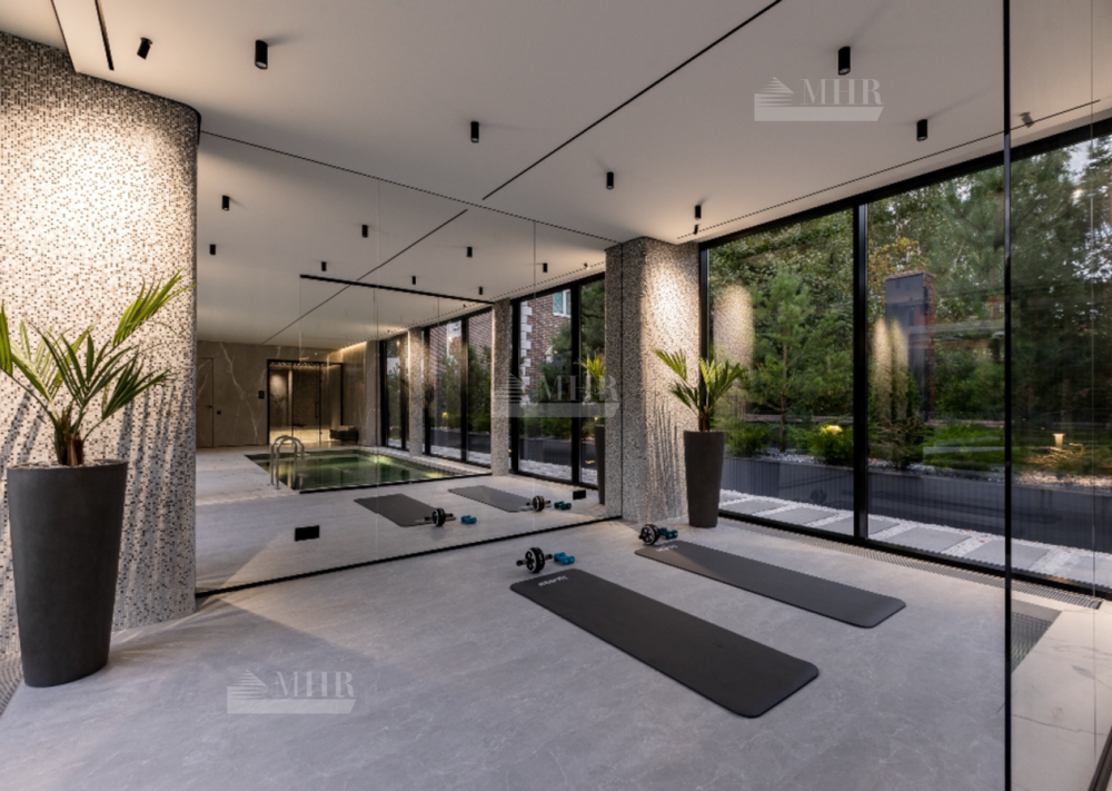 1-й этаж: холл, гардеробная, с/у, постирочная, гостевая спальня с с/у, гостиная, кухня, кладовая, столовая с выходом на террасу, СПА-зона: хамам, с/у, бассейн, спортзал, гараж на 2авто, квартира для персонала с отдельным входом;