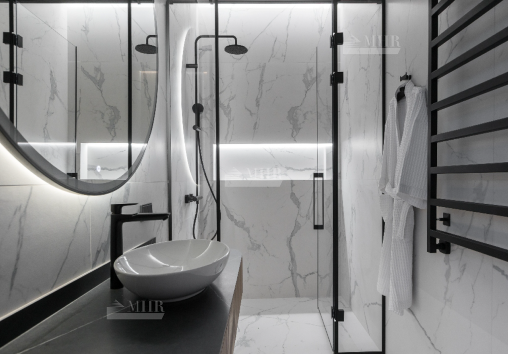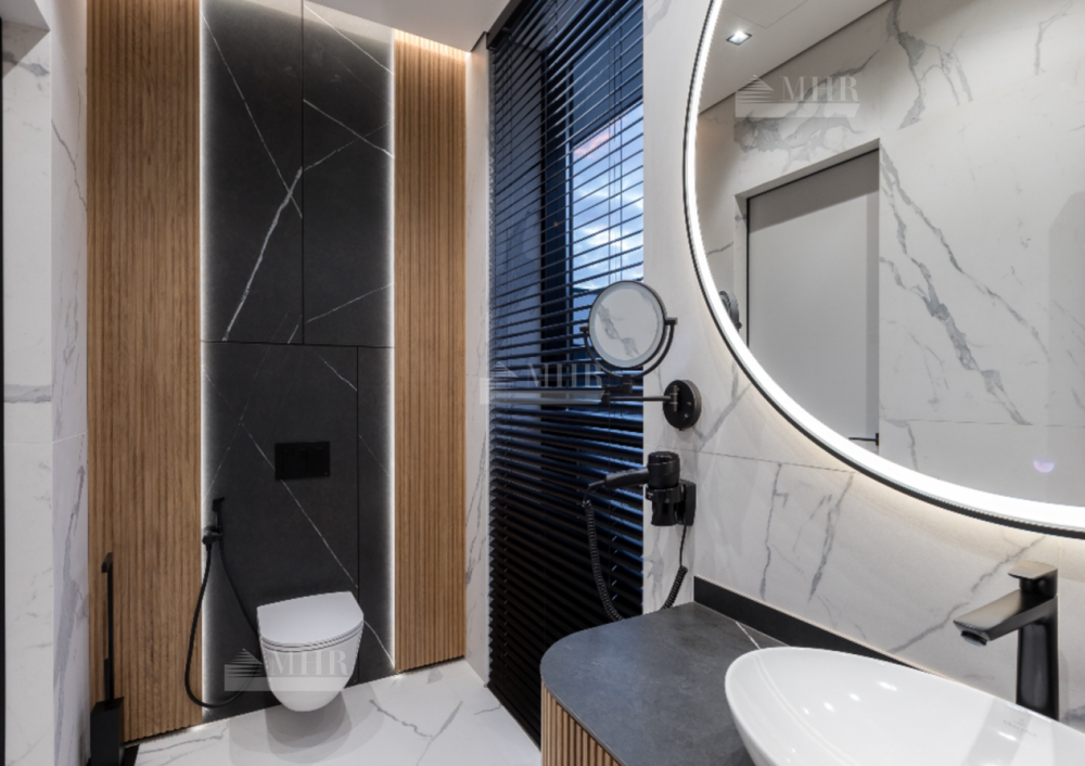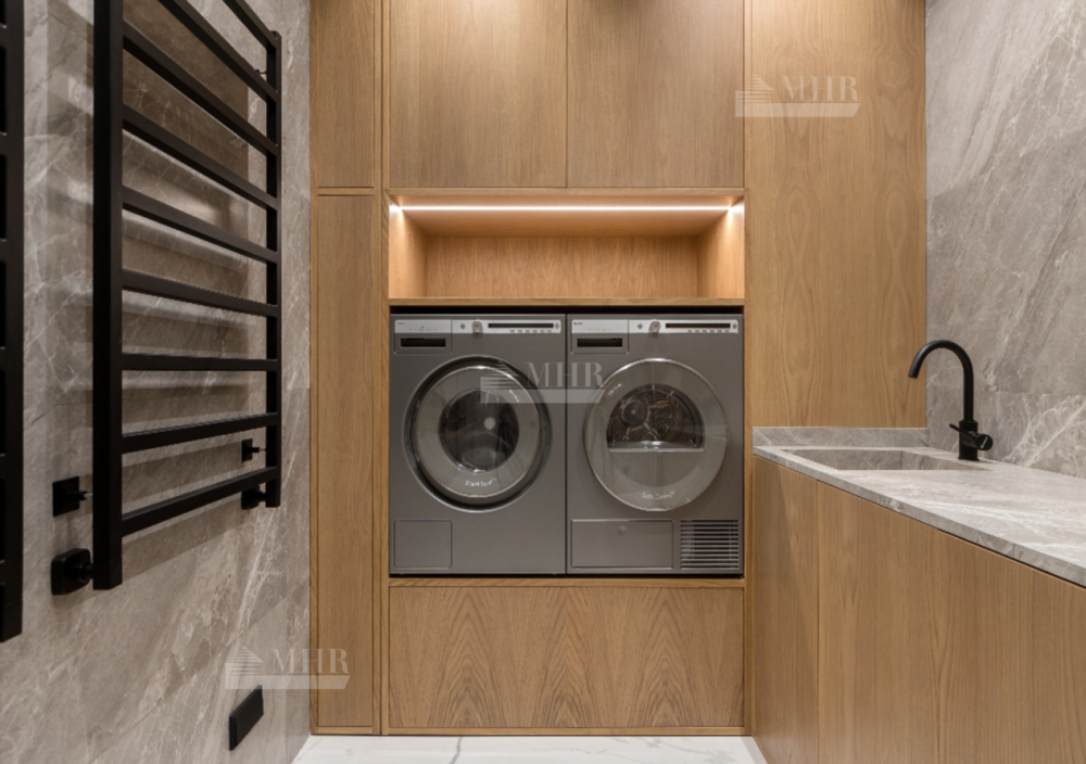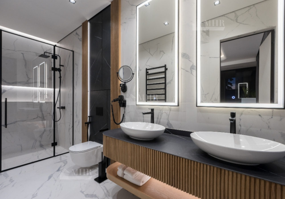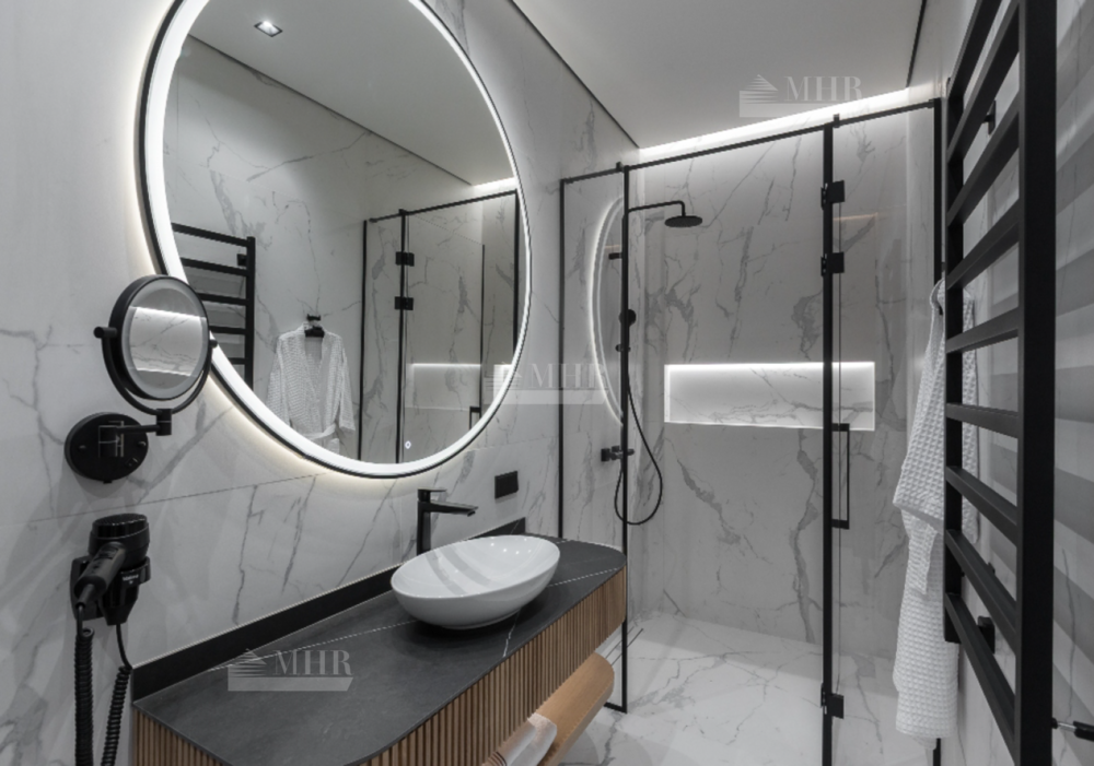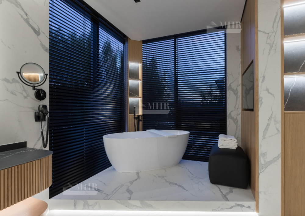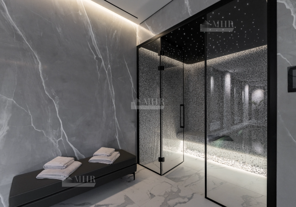 1-й этаж: холл, гардеробная, с/у, постирочная, гостевая спальня с с/у, гостиная, кухня, кладовая, столовая с выходом на террасу, СПА-зона: хамам, с/у, бассейн, спортзал, гараж на 2авто, квартира для персонала с отдельным входом;