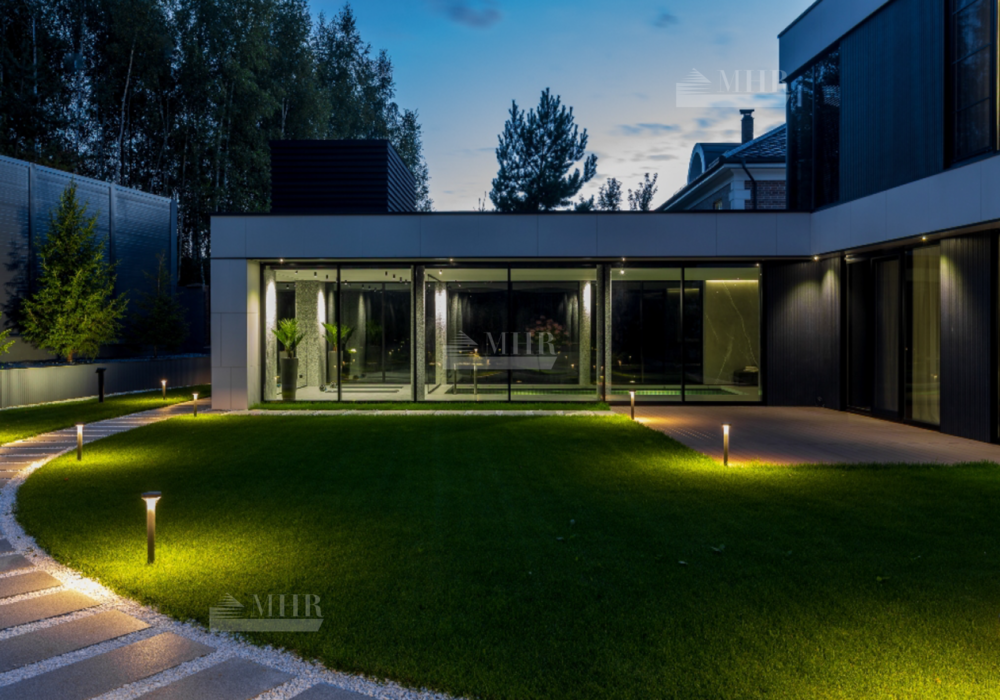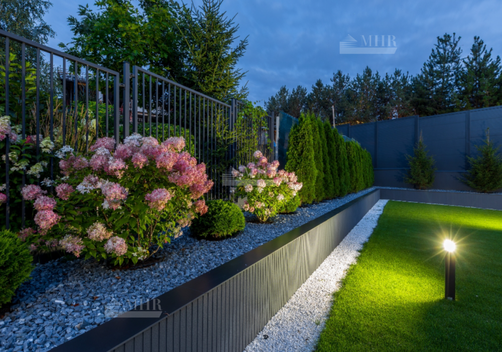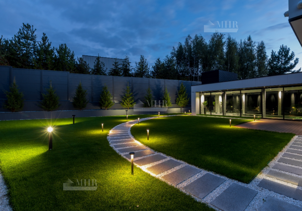 На участке проведены ландшафтные работы, сделаны дорожки и освещение.