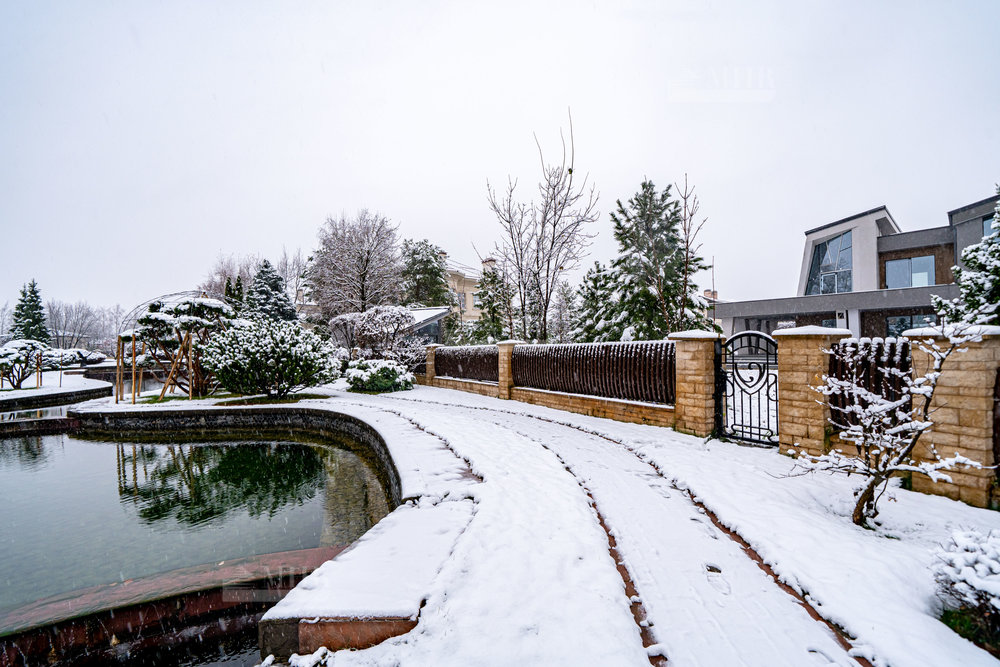 1-й этаж: прихожая, гардеробная, 2 холла, кухня, столовая, гостиная, спальня с с/у, кинотеатр, кладовая, 2 с/у, постирочная, котельная, терраса, зона барбекю, гараж для 4-х автомобилей с квартирой для персонала на втором этаже с отдельным входом, СПА-зона с бассейном, хаммамом, сауной, раздевалкой, террасой и санузлом;