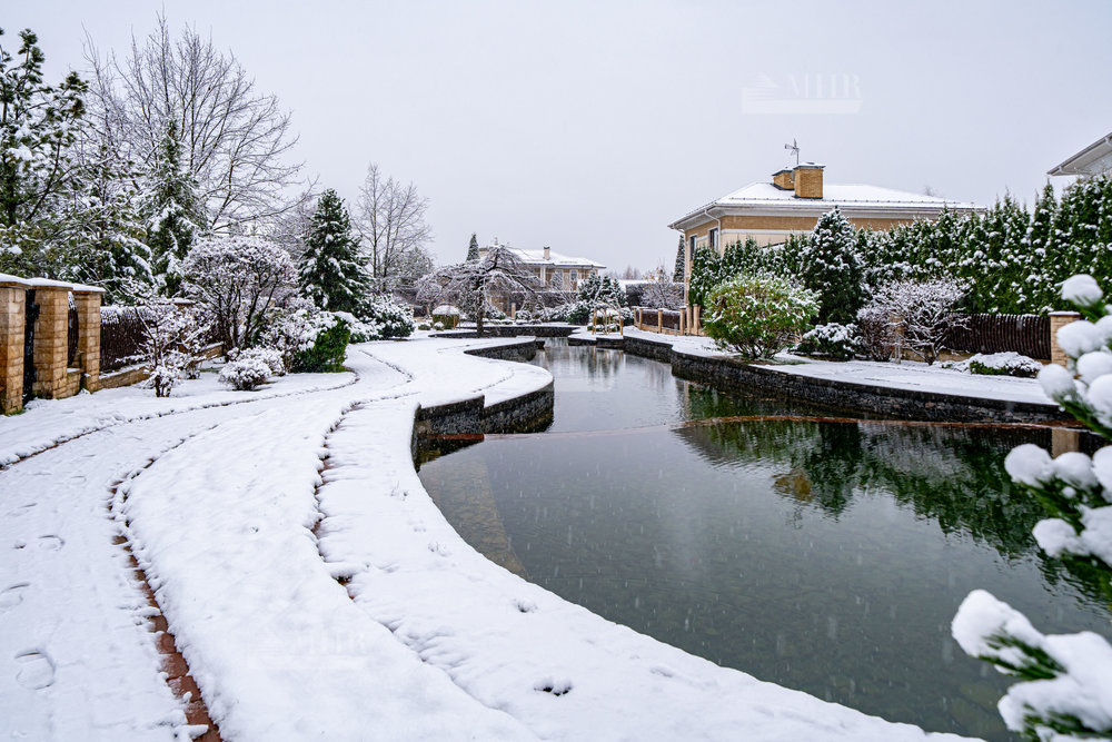 Участок выходит к водному каналу и окружён зрелыми хвойными деревьями, создающими приватность и мягкое природное обрамление. Предусмотрены закрытые и открытые террасы, зона барбекю.