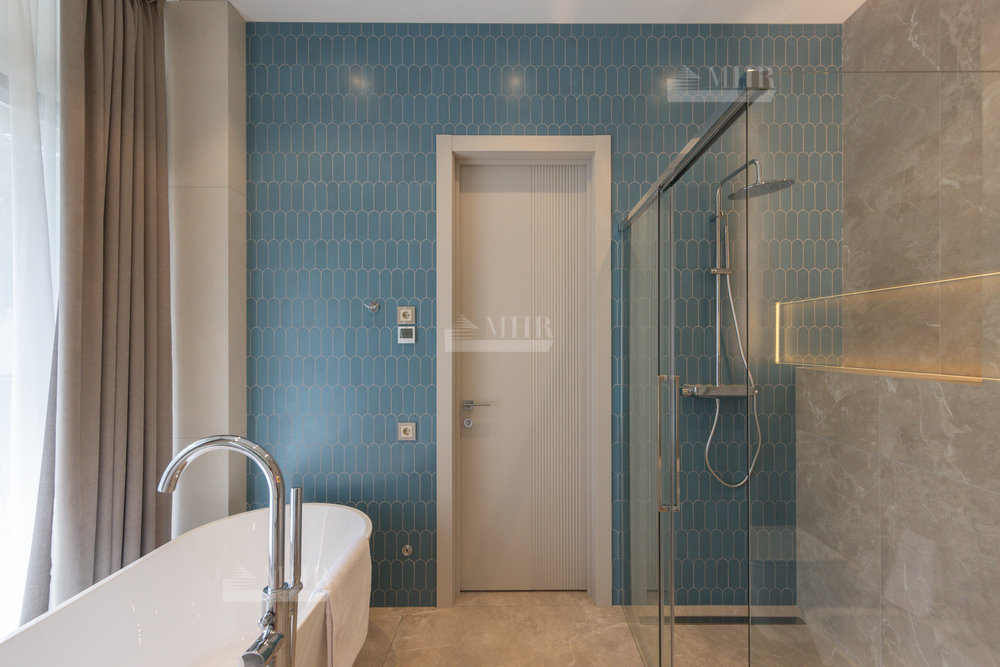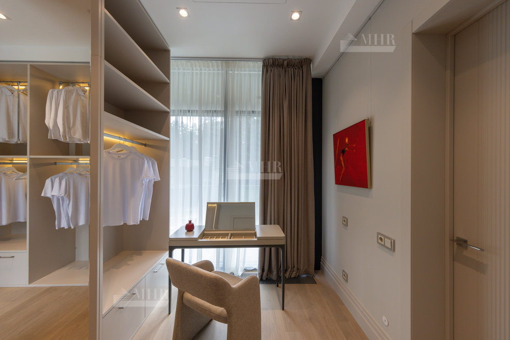 2-й этаж: 3 спальни с индивидуальными санузлами и гардеробными, а также выход на эксплуатируемую крышу с террасой.