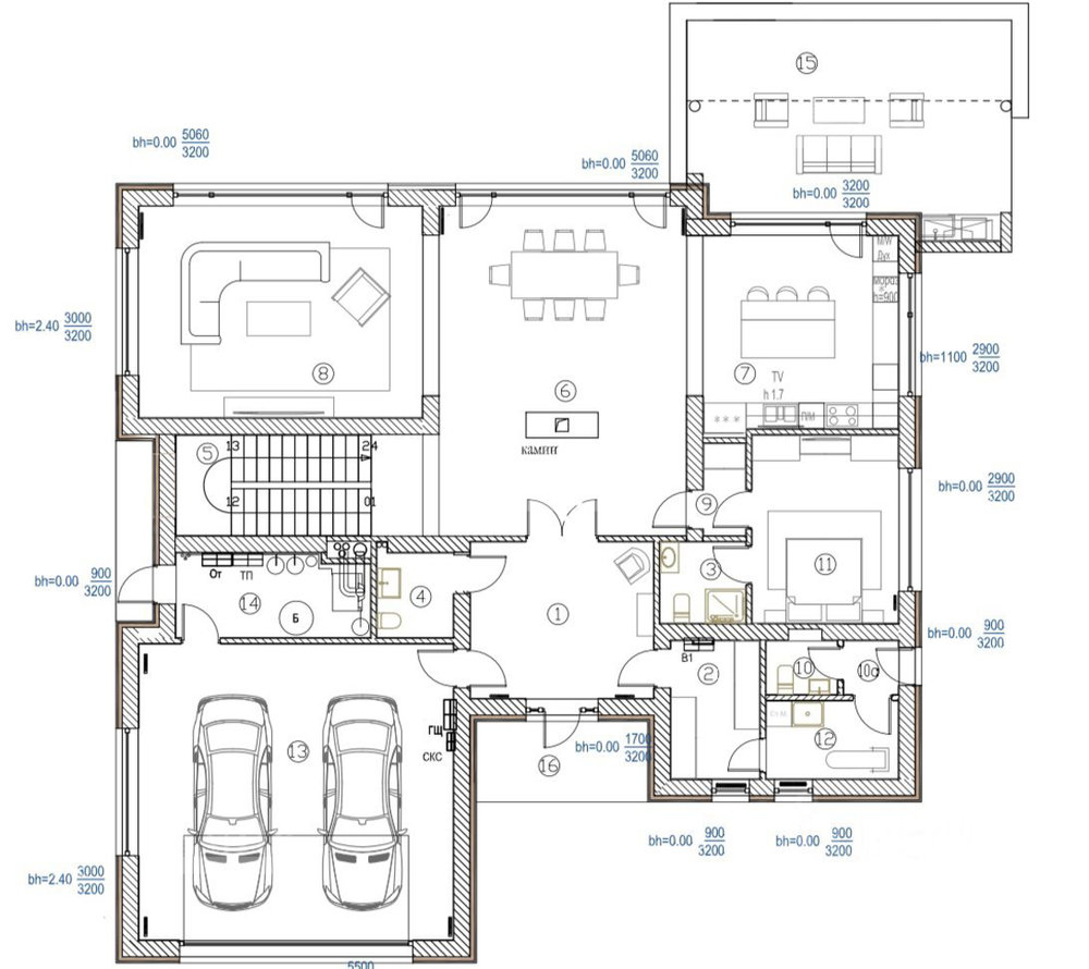 1 этаж: прихожая, гостиная, кухня-столовая, терраса, гараж, квартира для персонала, санузел, гардеробная, постирочная.
