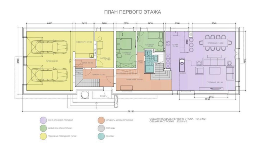 1-й этаж: прихожая, гостиная-кухня-столовая, терраса, гостевая спальня, с/у, гараж на 2 м/м;