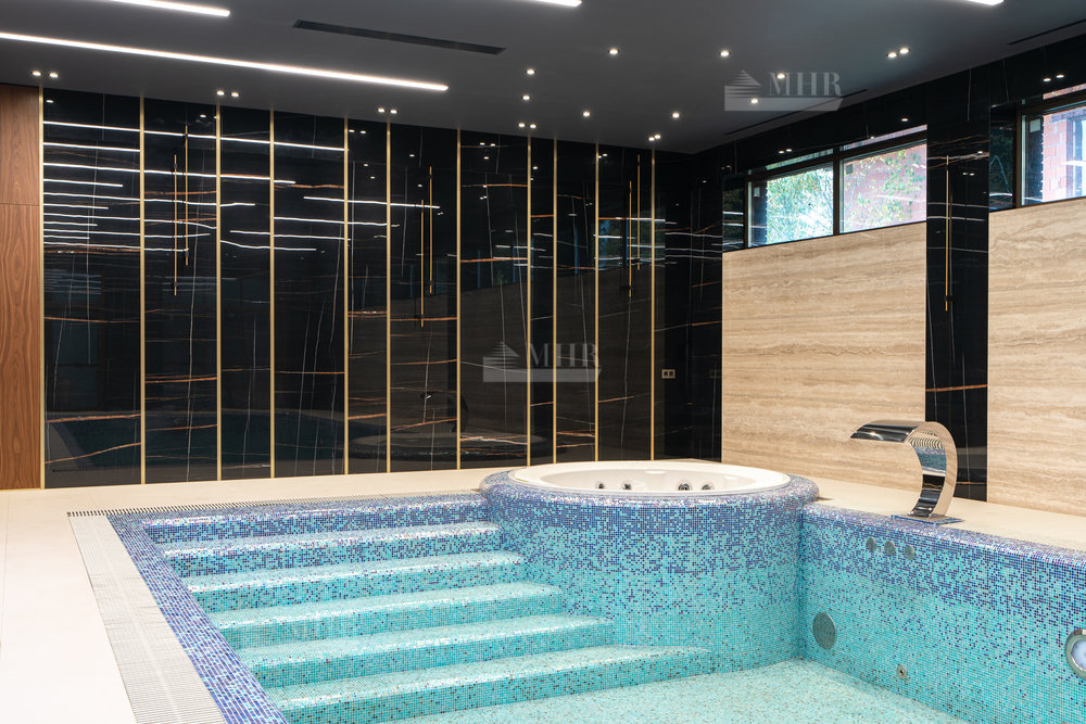 1-й этаж: прихожая, гардеробная, гостевой санузел, холл, кухня, просторная столовая, гостиная с камином, кабинет, спальня с гардеробной и ванной комнатами, коридор, сауна, комната отдыха, душевая, санузел, постирочная, галерея, связывающая основной дом с бассейном, гаражом, хозблоком и бойлерной.