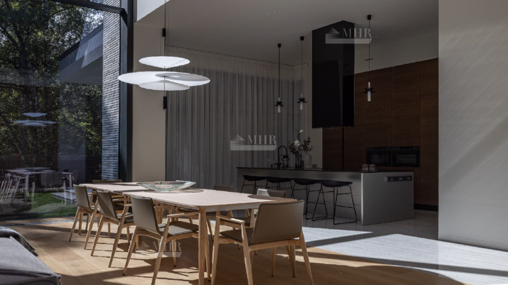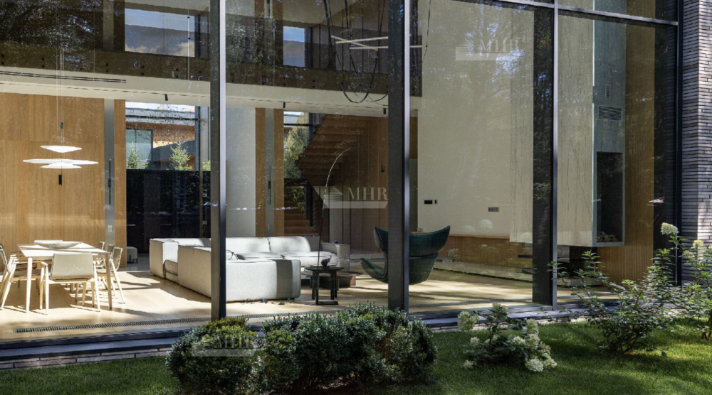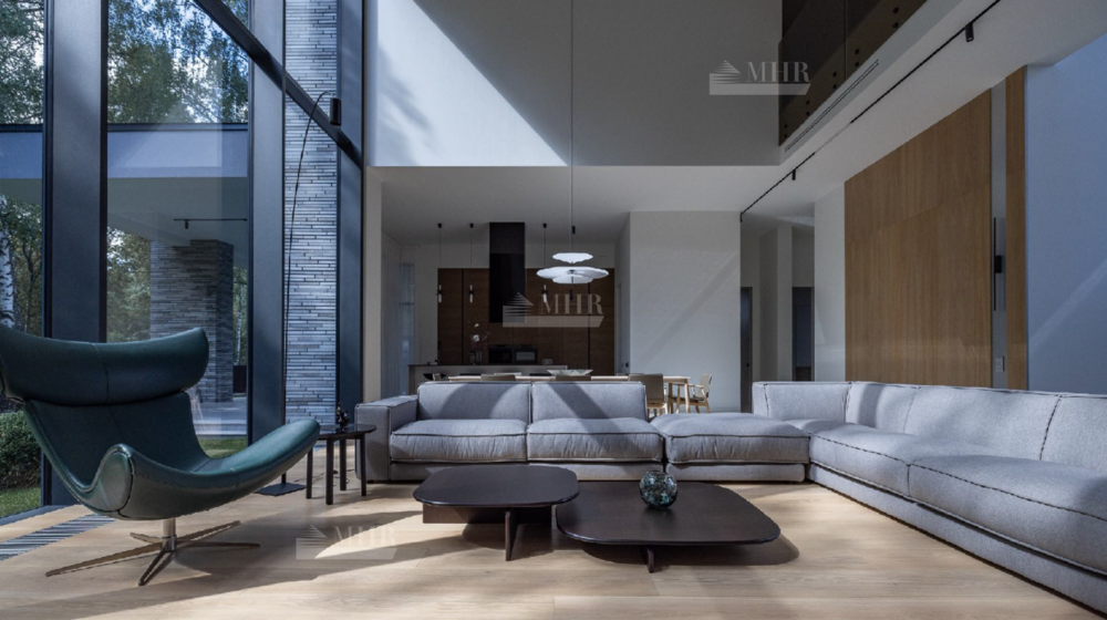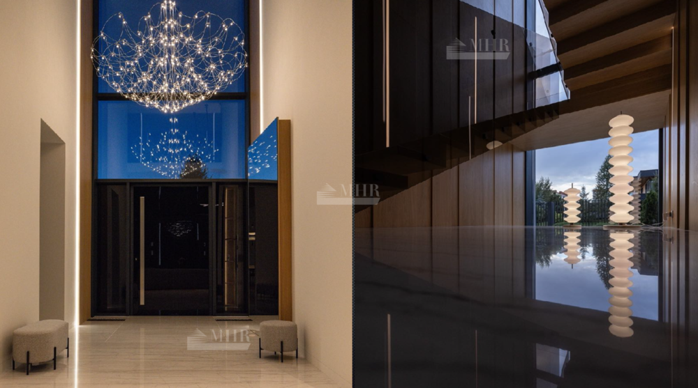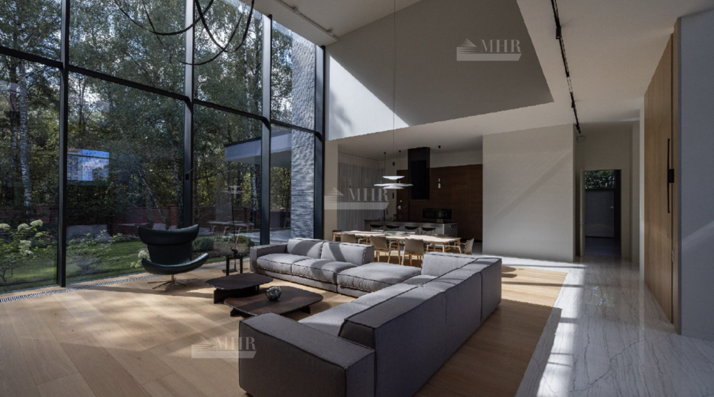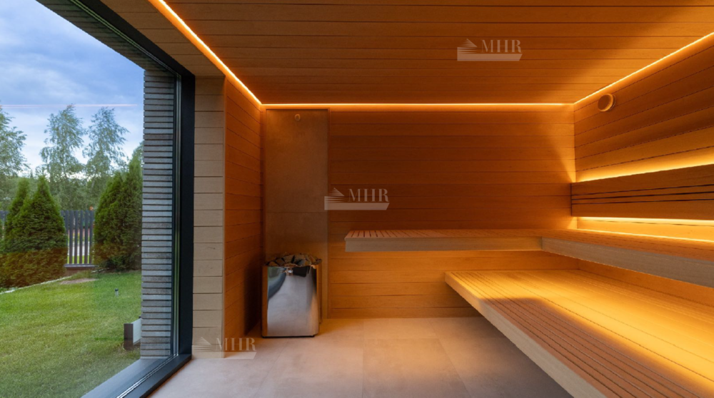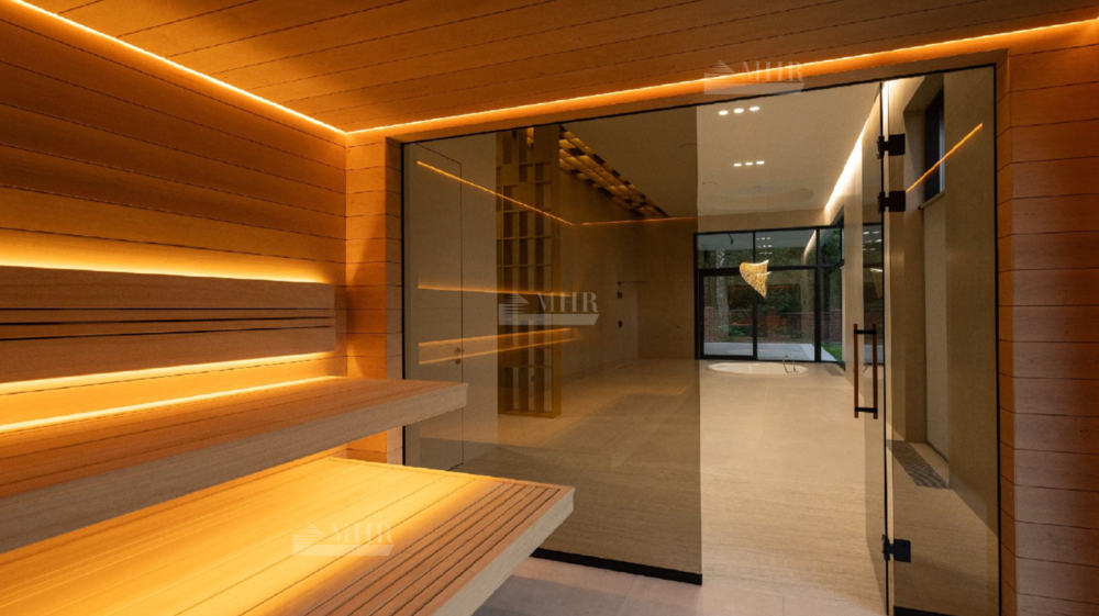 1-й этаж: прихожая с гардеробной комнатой, кухня-столовая с выходом на патио, гостиная с камином и вторым светом, спальня с/у и гардеробной, СПА-зона с сауной, гостевой с/у, постирочная;