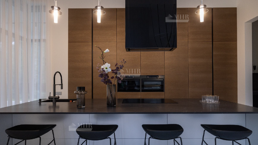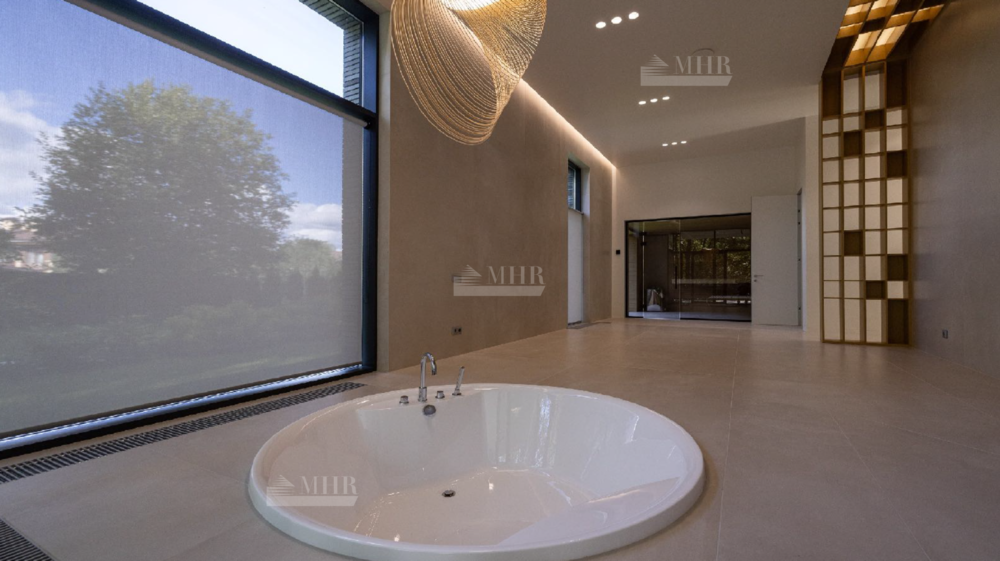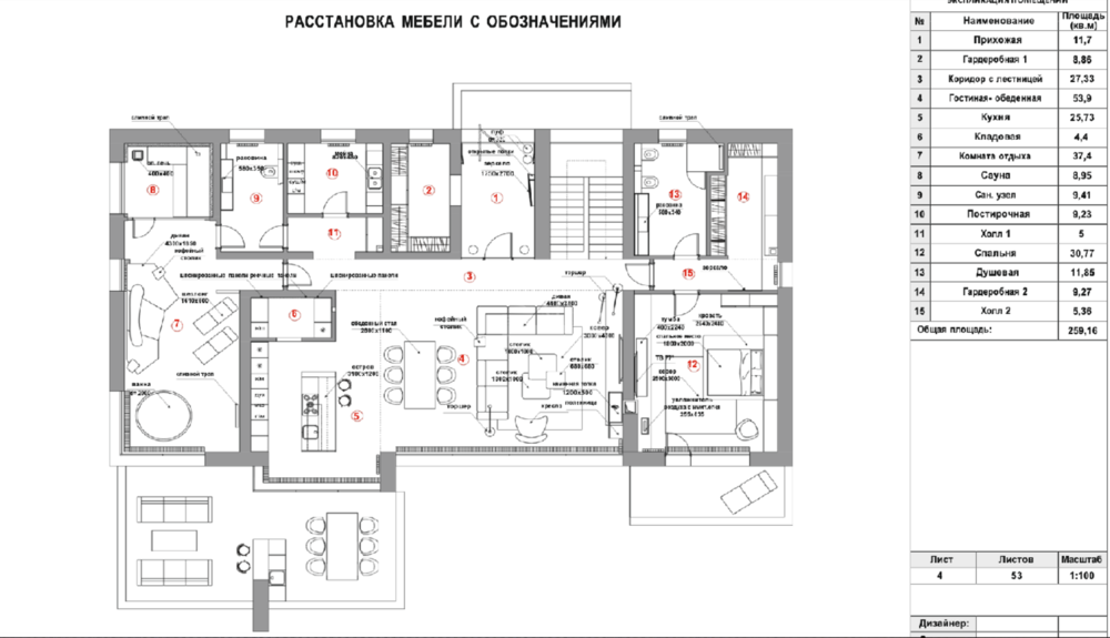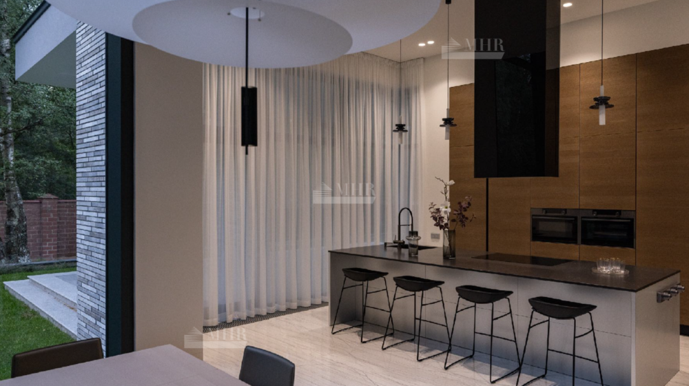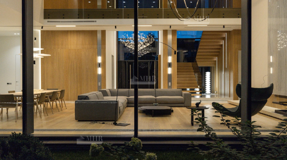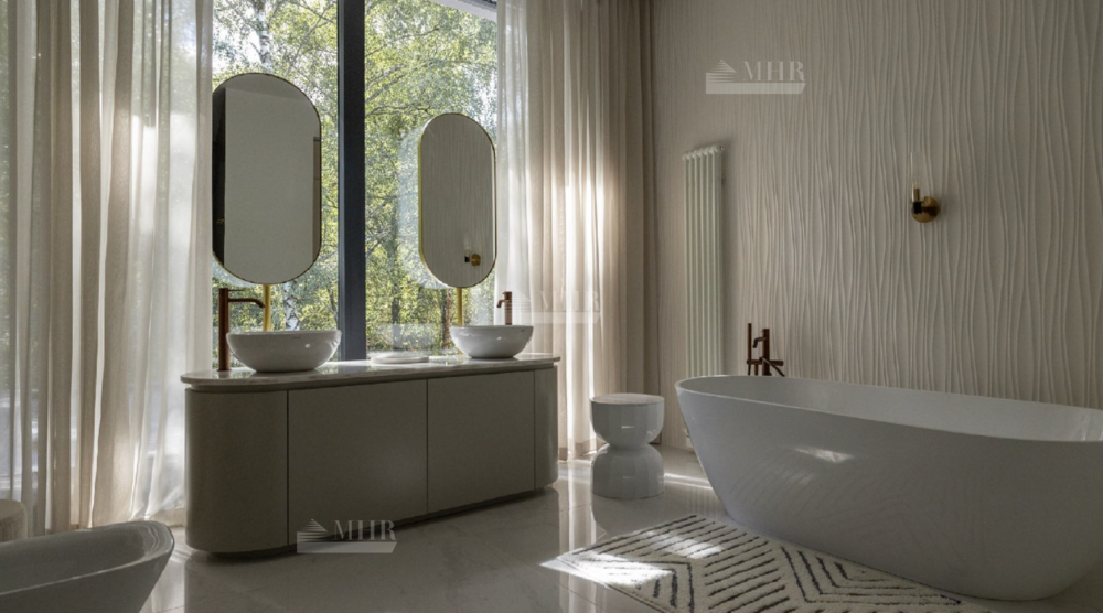 1-й этаж: прихожая с гардеробной комнатой, кухня-столовая с выходом на патио, гостиная с камином и вторым светом, спальня с/у и гардеробной, СПА-зона с сауной, гостевой с/у, постирочная;