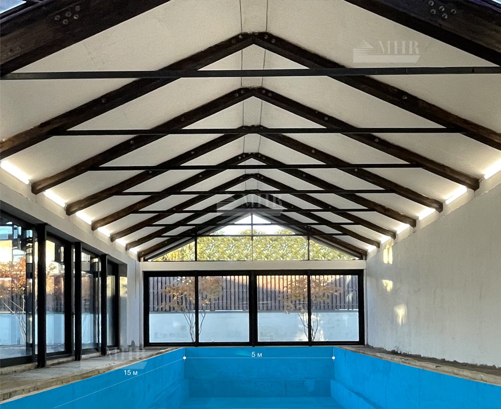 1 этаж: 664 м² - 15-метровый бассейн, Спа-зона с хаммамом и сауной, столовая и каминный зал. Технические помещения и гараж также находятся на первом этаже.