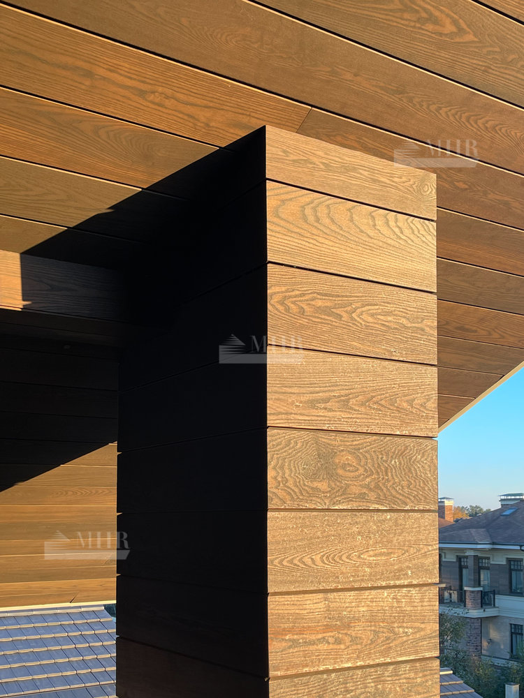 Внешние стены полностью выполнены из стекла. Последний этаж дома дополнен просторной террасой, с которой открывается потрясающий вид на окрестности.