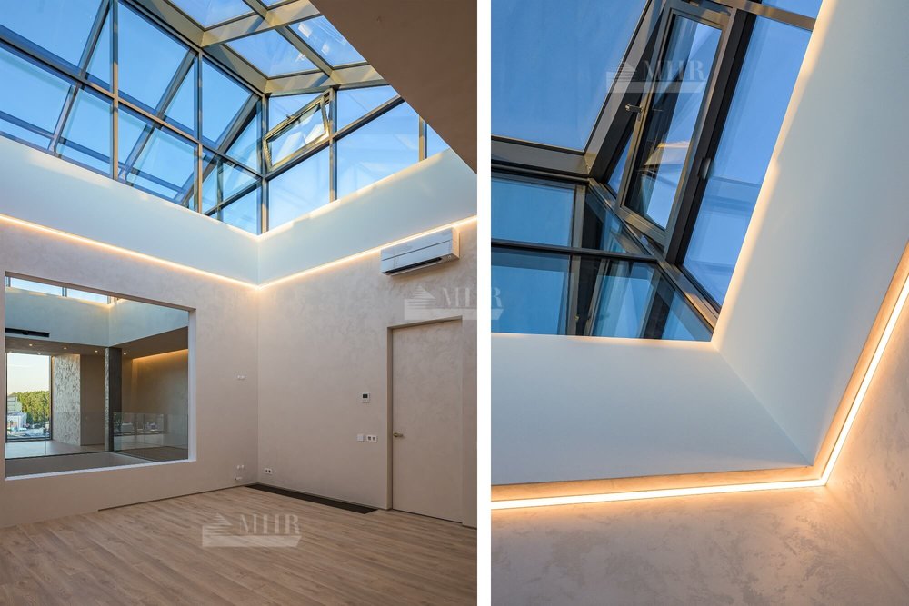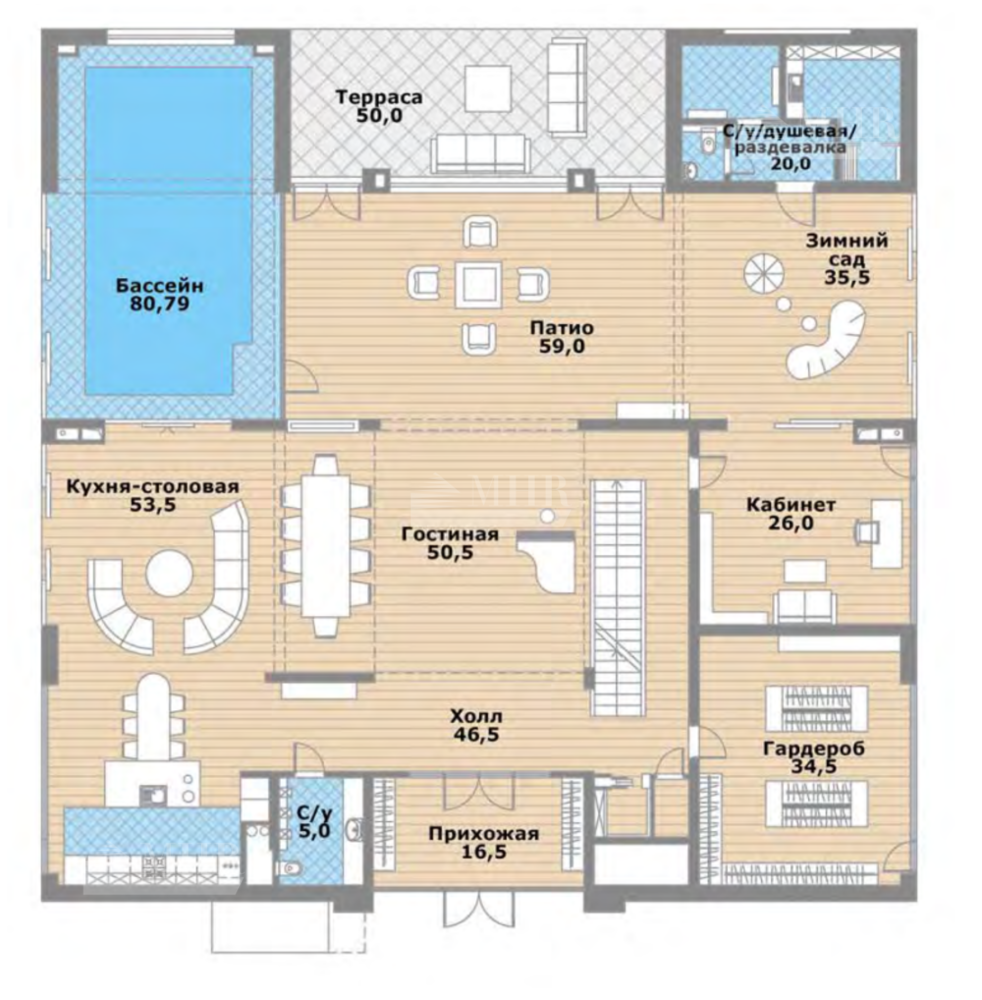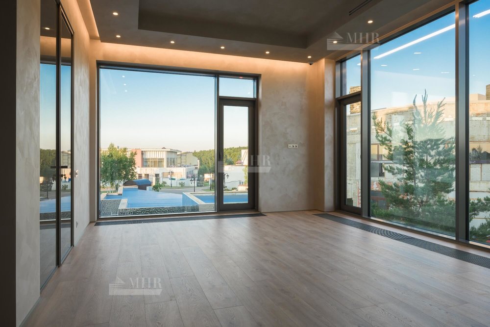 1 этаж - прихожая, холл с просторной гардеробной, гостиная со вторым светом, кухня-столовая, патио с выходом на террасу, кабинет с выходом в зимний сад, бассейн с раздевалкой / душевой и с/у, с/у.
