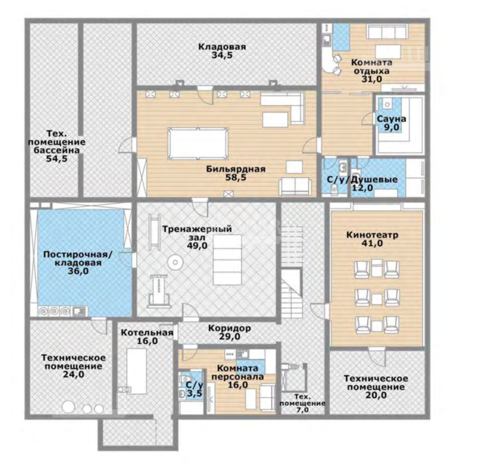 Цоколь - бильярдная, кинотеатр, тренажерный зал, сауна с комнатой отдыха и душевой с с/у, постирочная, комната персонала с с/у , котельная, технические помещения, кладовая, тех помещение бассейна, коридор.