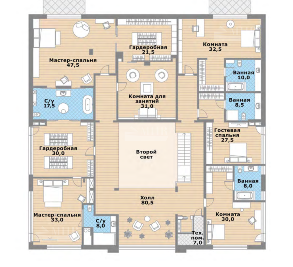 2 этаж - мaster-suite: две спальни с двумя гардеробными, ванной и с/у, комнатой для занятий или досуга. Спальня с ванной, спальня с ванной, спальня с ванной, холл, тех помещение.