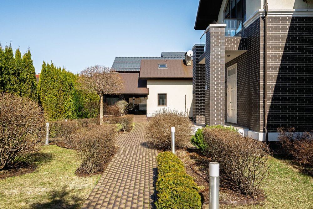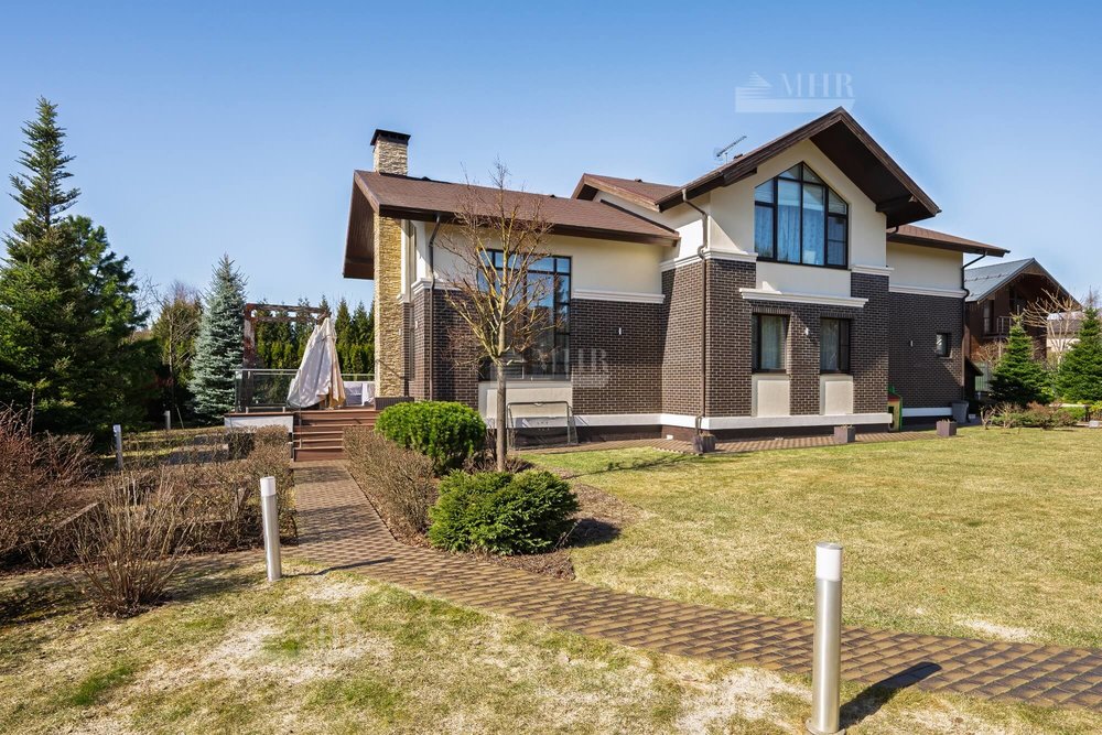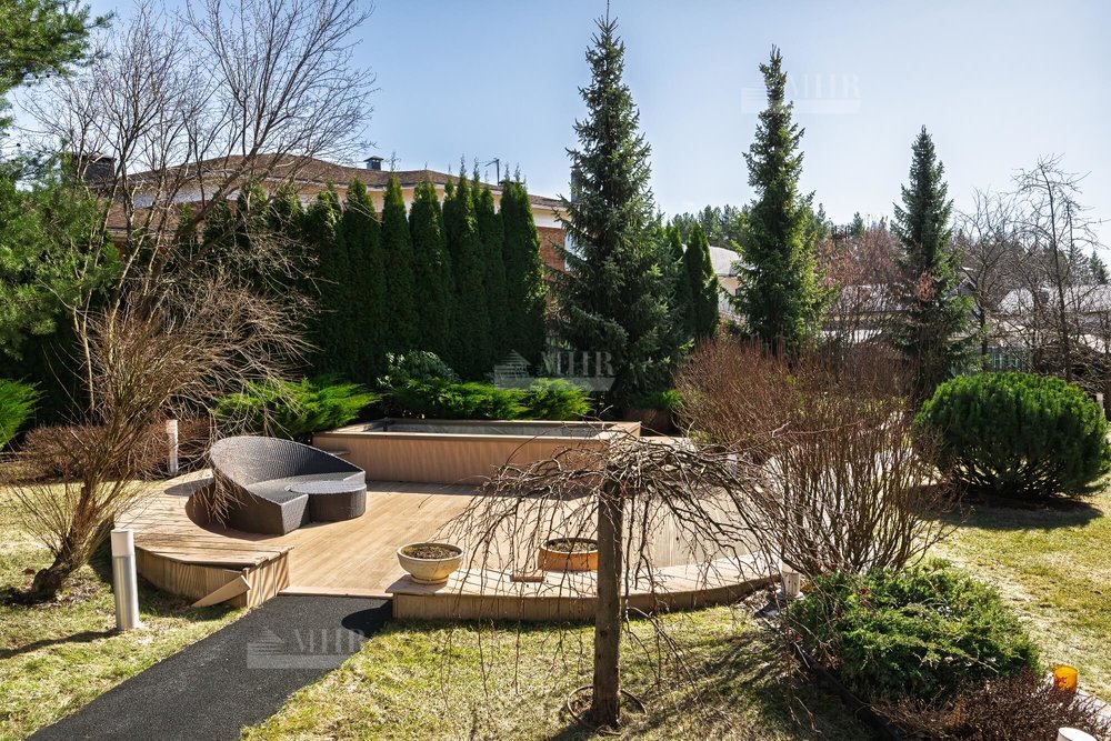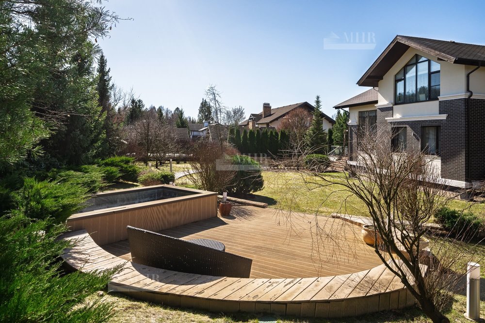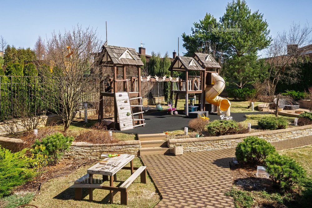 Выполнен профессиональный ландшафтный дизайн участка. Высажены цветы, туи, сосны и декоративные кустарники. Постелен газон, проложены дорожки, выполнено освещение. Для детей оборудована площадка. Организована лаунж-зона с декоративным водоемом.