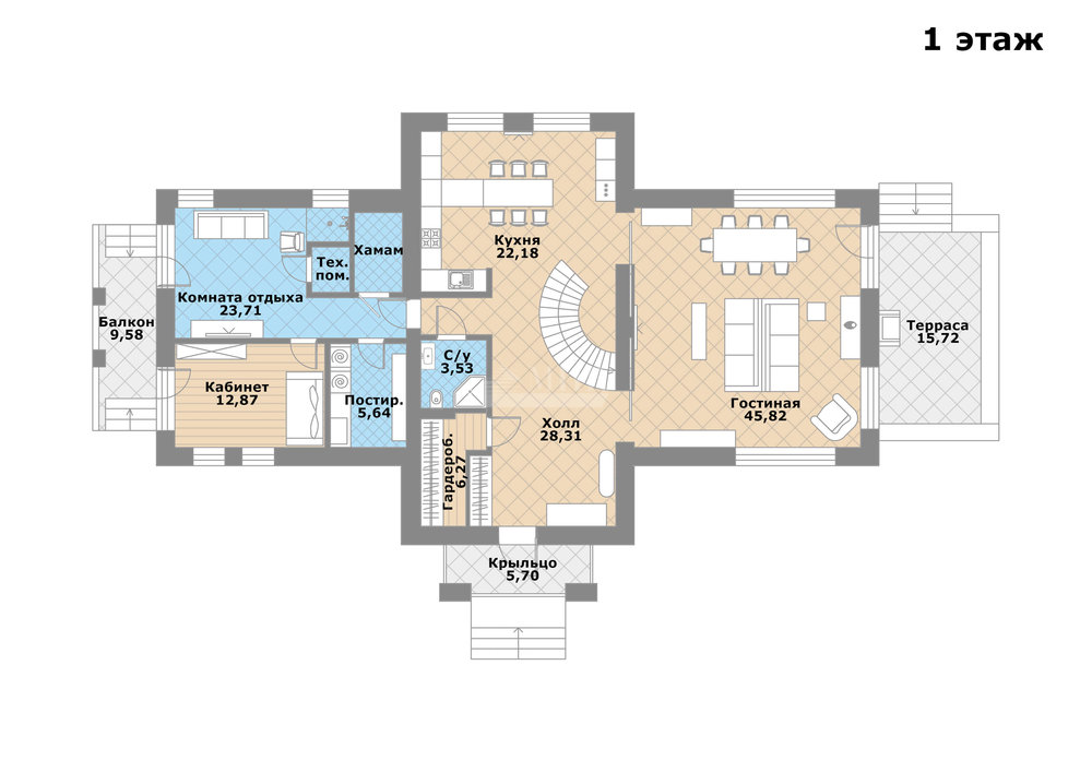 1-й этаж: кухня-столовая, гостиная с выходом на террасу, прихожая, гардеробная, крыльцо, с/у, хамам, комната отдыха, кабинет, балкон, постирочная, тех. помещение;