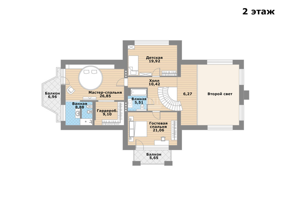 2-й этаж: холл, мастер-спальня, ванная комната, гардеробная, балкон, детская спальня, ванная, гостевая спальня с балконом.