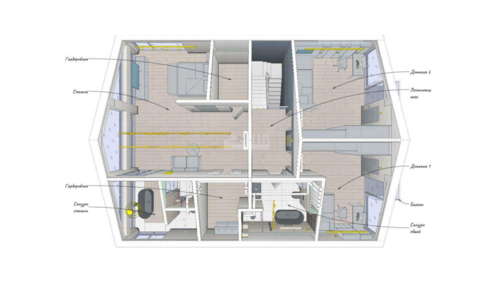 2й этаж: 2 детские комнаты (по проекту, сейчас в них кабинет и гостевая), на эти комнаты с/у свой, мастер-спальня (43кв) с 2-мя гардеробными и своим с/у.