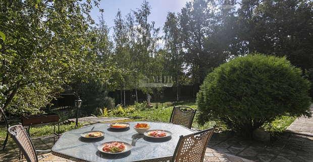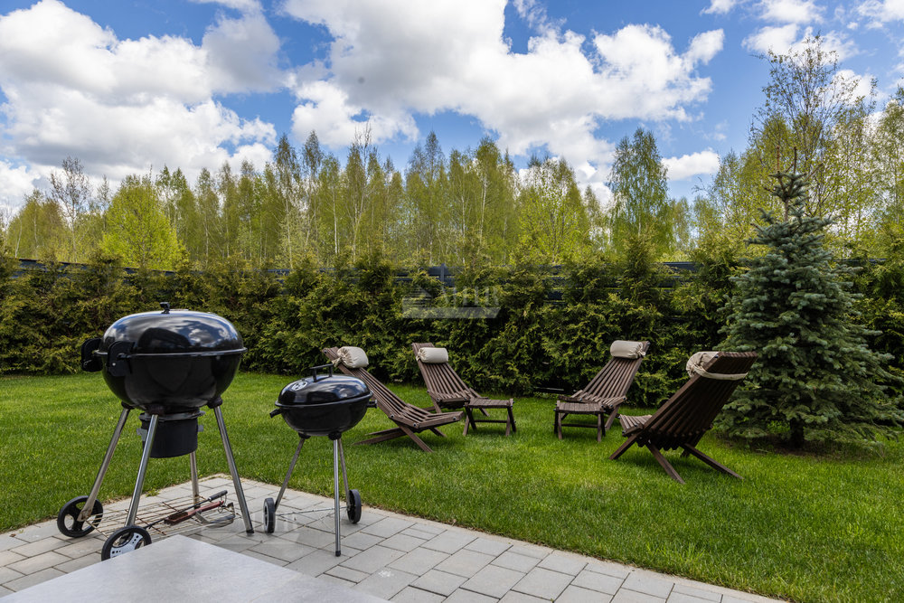 Рядом с террасой обустроена зона отдыха с местом для барбекю, участок ухожен, засеян газон, высажены деревья и туи.