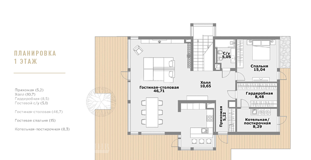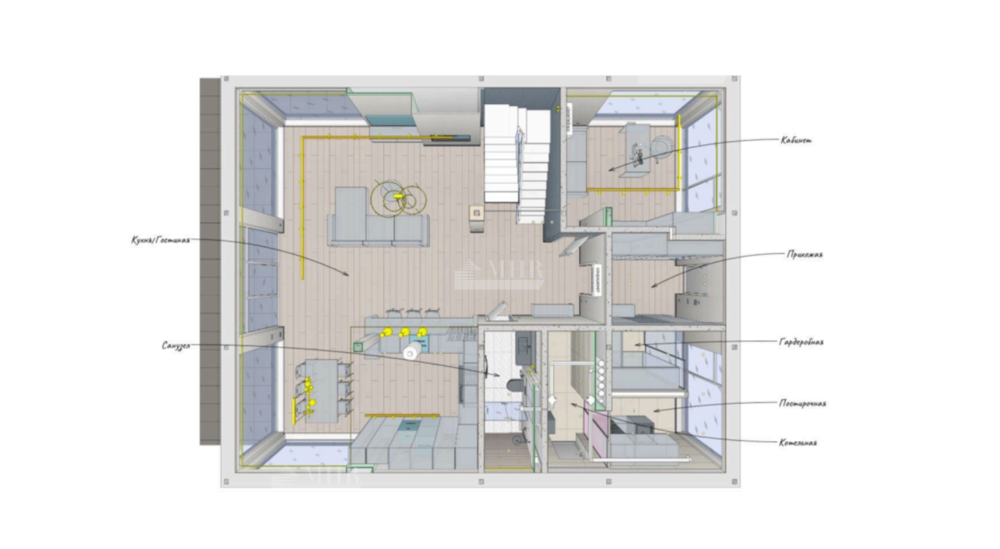 1й этаж: прихожая, зимняя гардеробная, постирочная, котельная, кабинет, с/у, кухня-гостиная, дровяной камин;