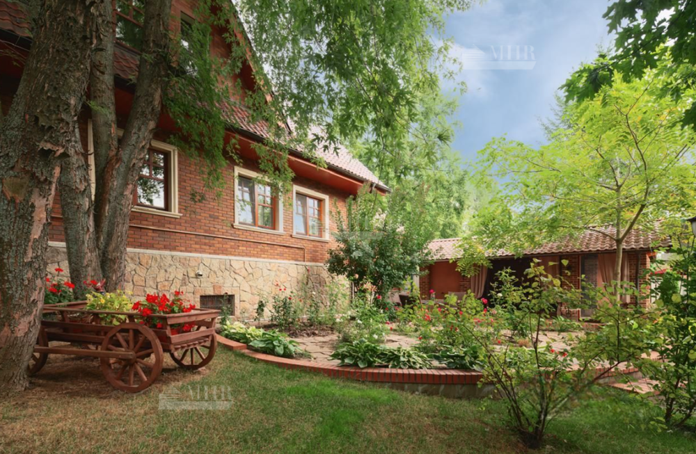 Участок с ландшафтным дизайном, красивое уличное освещение.  В центре сада располагается закрытая терраса с камином. Есть зона барбекю.