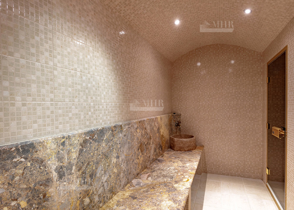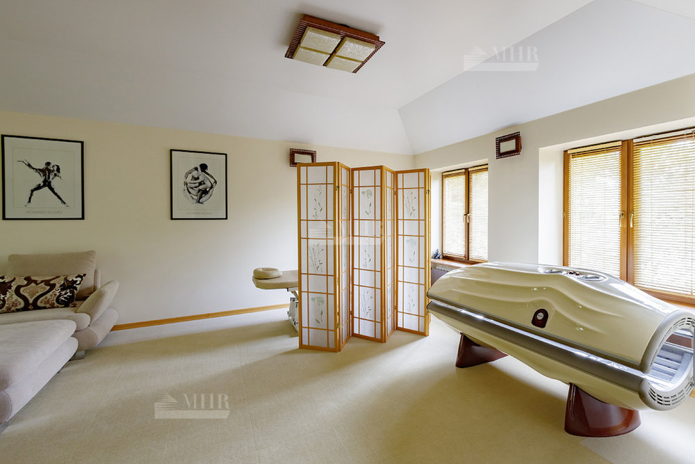 1 этаж -  прихожая-холл, кухня, столовая - гостиная с камином, со вторым светом и выходом на участок, зимний сад с выходом в галерею, 2 санузла, домашний кинотеатр, СПА-зона, хамам, сауна, 2 душа, санузел, тренажерный зал, комната отдыха с массажной и солярием, санузел, блок для персонала: кухня, 3 спальни, комната для охраны, санузел, постирочная, котельная, гараж на 4 авто.