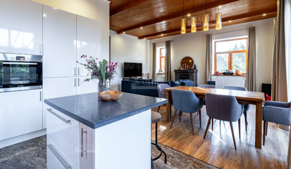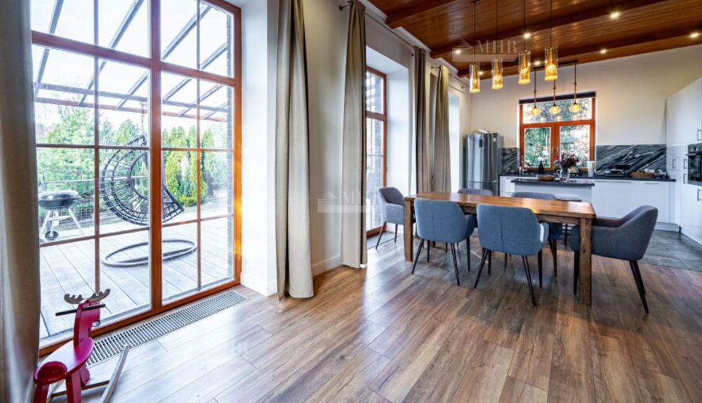 На прилегающем участке обустроены терраса и отличная зона для барбекю. Для автомобилей предусмотрен гараж и дополнительные места для парковки.