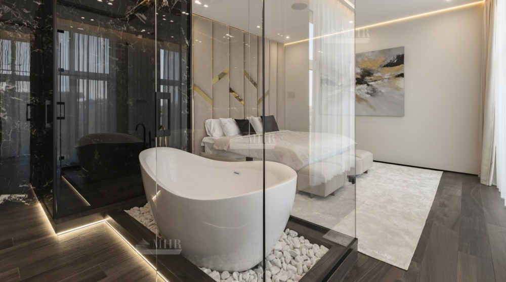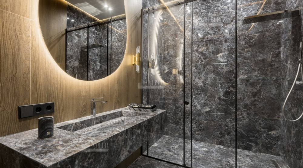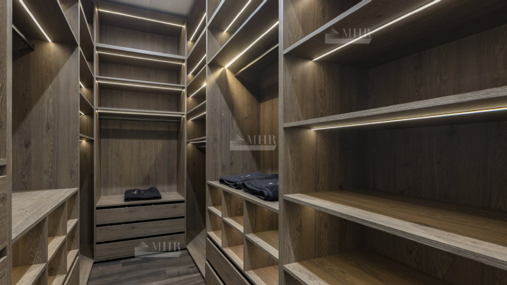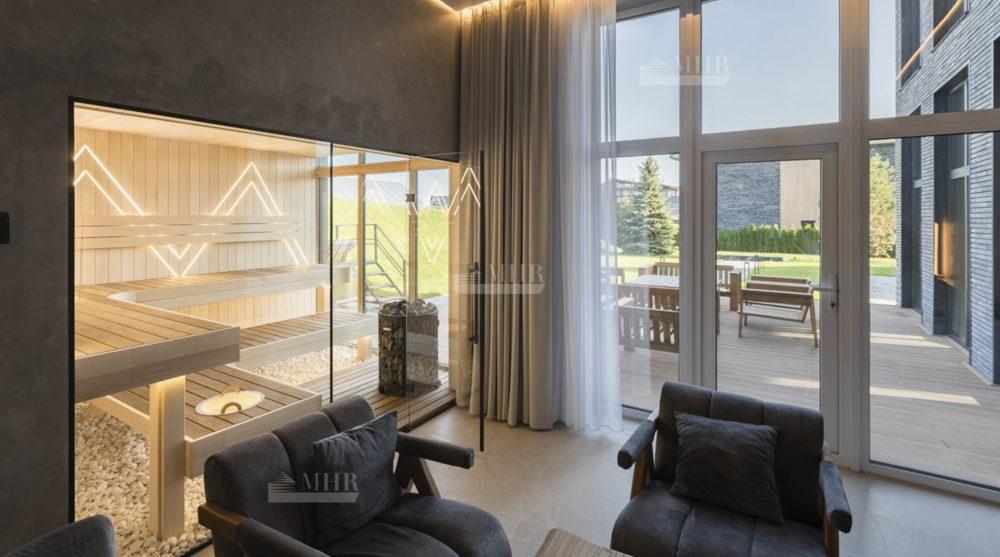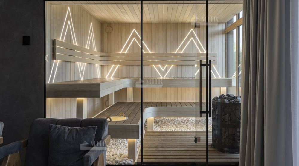Планировка включает 3 спальни, вместительные гардеробные и спа-зону с парной с печью Harvia и комнатой отдыха.
