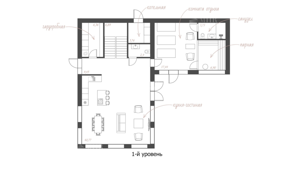 1й этаж: холл, гардеробная, гостиная-кухня-столовая, спа-зона с парной, душевой и комнатой отдыха, санузел, котельная,терраса;