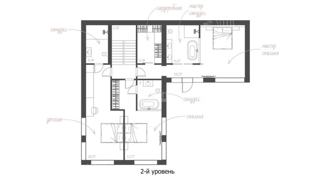 2й этаж: холл, мастер-спальня с гардеробной и санузлом, спальня с гардеробной и санузлом, спальня с санузлом.