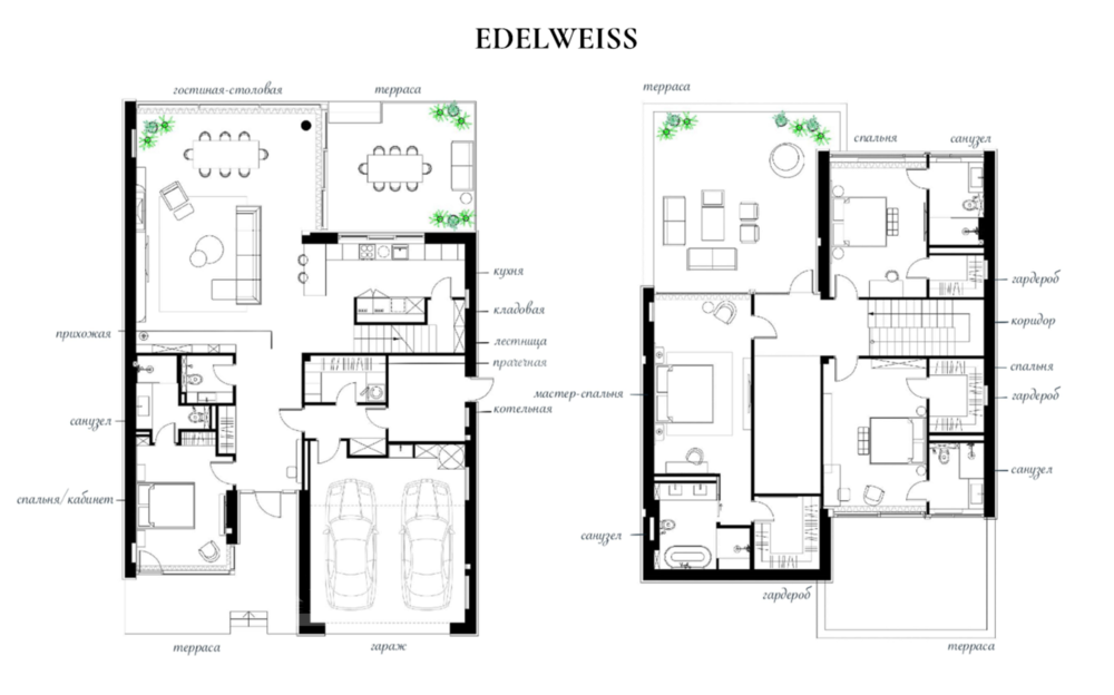2 этаж: мастер-спальня с  с/у и гардеробной , 2 спальни с с/у и гардеробной, терраса.