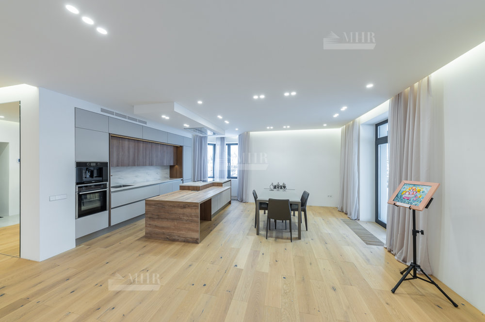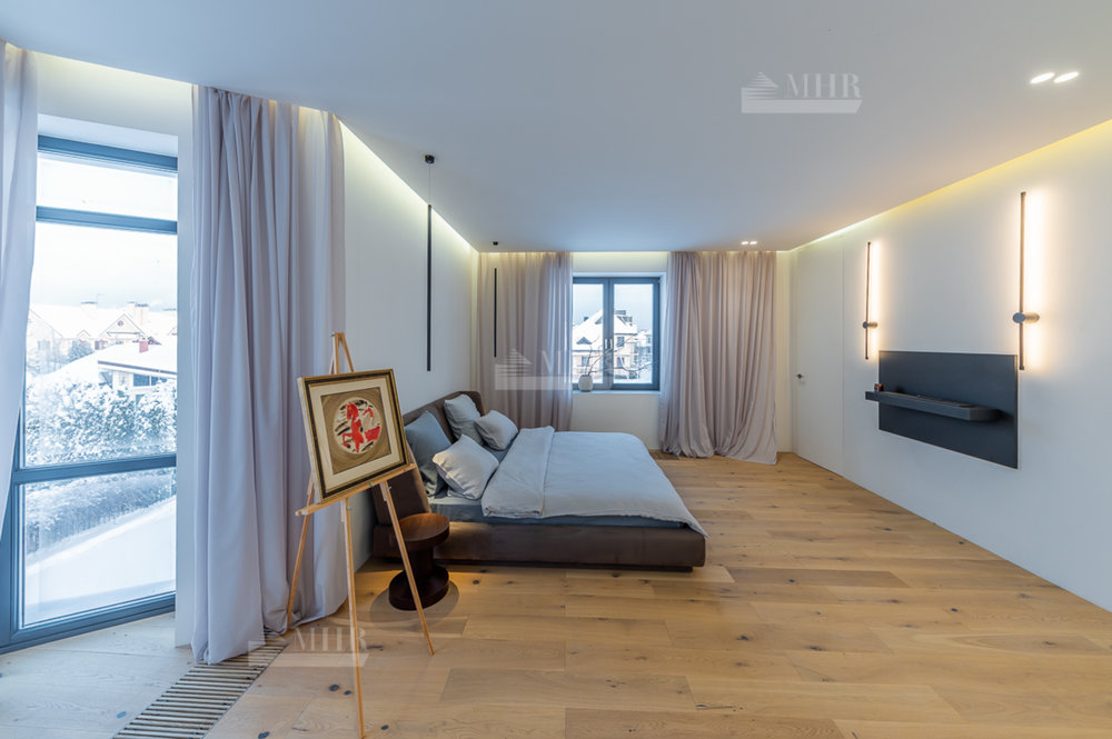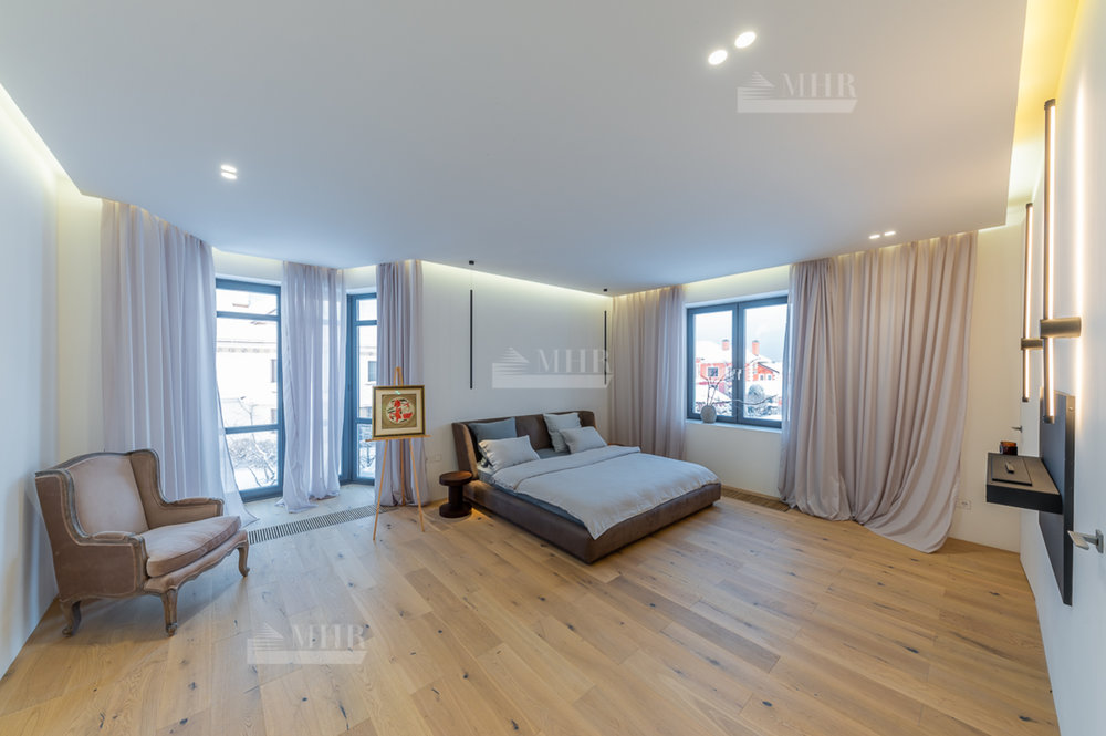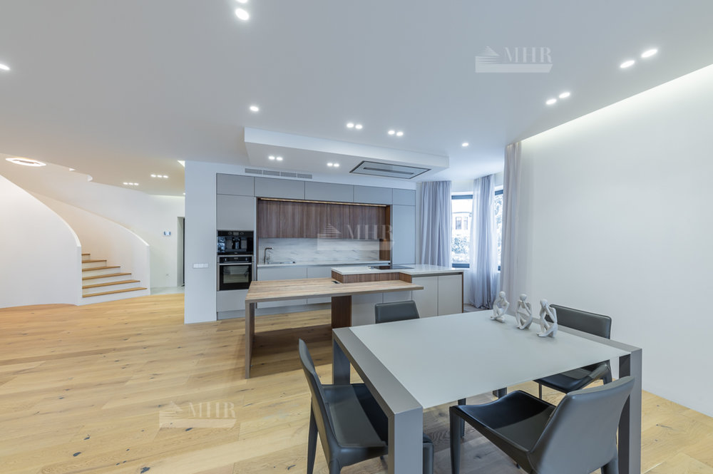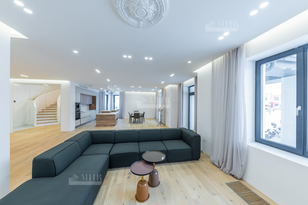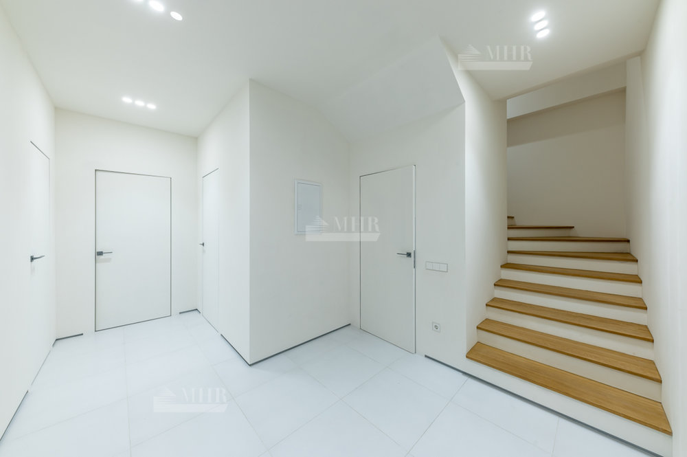 1 этаж: Просторная зона прихожей, гардеробная комната для верхней одежды и дополнительная комната для несезонных вещей, кухня-гостиная с панорамными окнами, биокамином и выходом на летнюю террасу, современный кухонный гарнитур (со встроенной техникой: посудомоечная машина, холодильник, духовой шкаф, варочная панель и кофе машина. Вся техника немецкого производства). Кухонный остров со встроенной потолочной Итальянской вытяжкой. Гостевая комната с отдельным санузлом, котельная (газовые котлы Buderus);