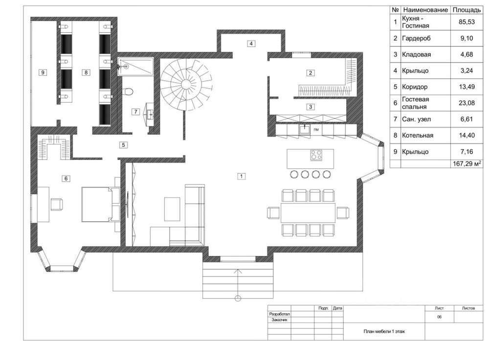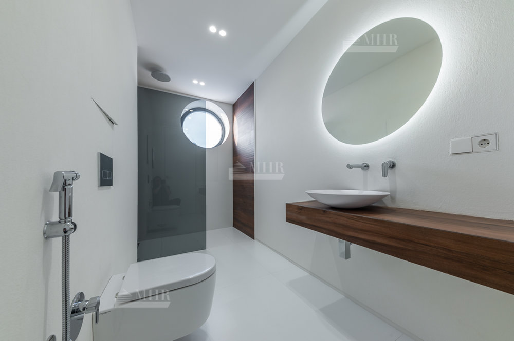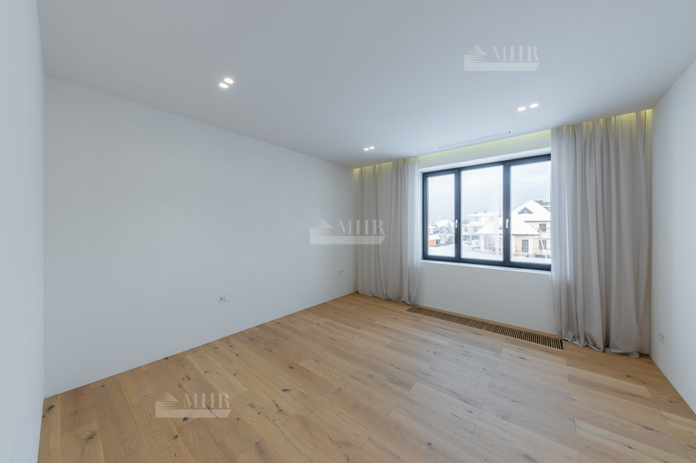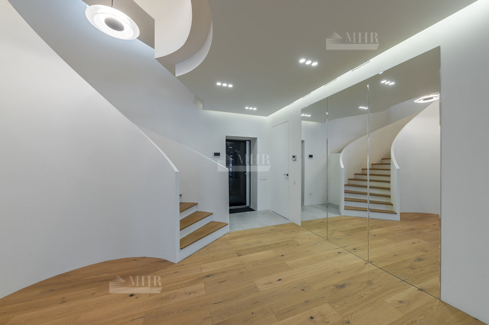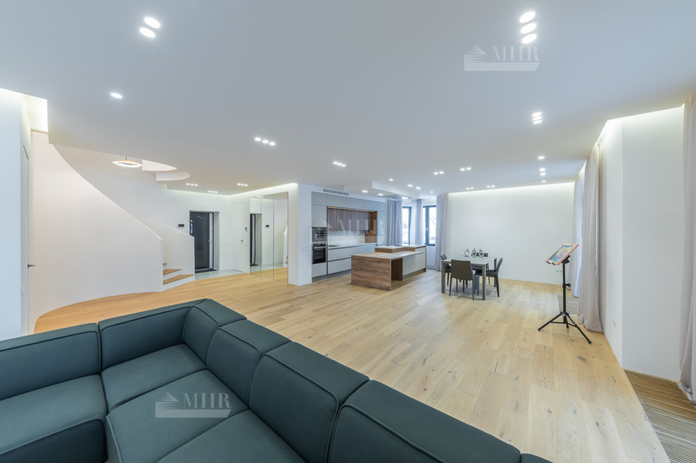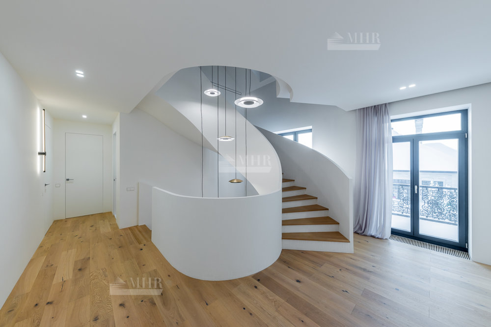 1 этаж: Просторная зона прихожей, гардеробная комната для верхней одежды и дополнительная комната для несезонных вещей, кухня-гостиная с панорамными окнами, биокамином и выходом на летнюю террасу, современный кухонный гарнитур (со встроенной техникой: посудомоечная машина, холодильник, духовой шкаф, варочная панель и кофе машина. Вся техника немецкого производства). Кухонный остров со встроенной потолочной Итальянской вытяжкой. Гостевая комната с отдельным санузлом, котельная (газовые котлы Buderus);
