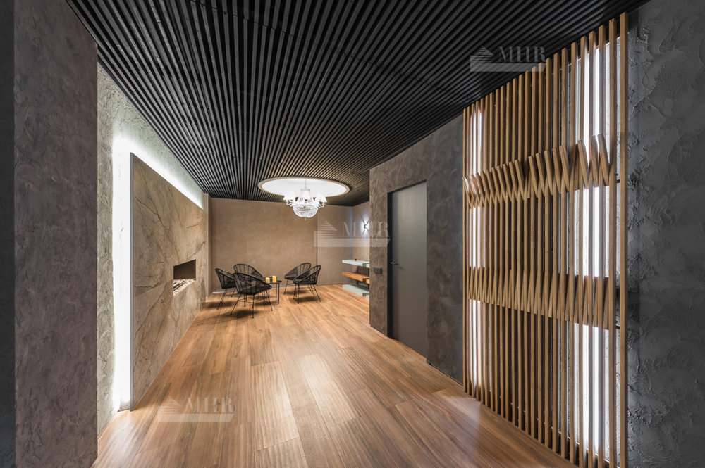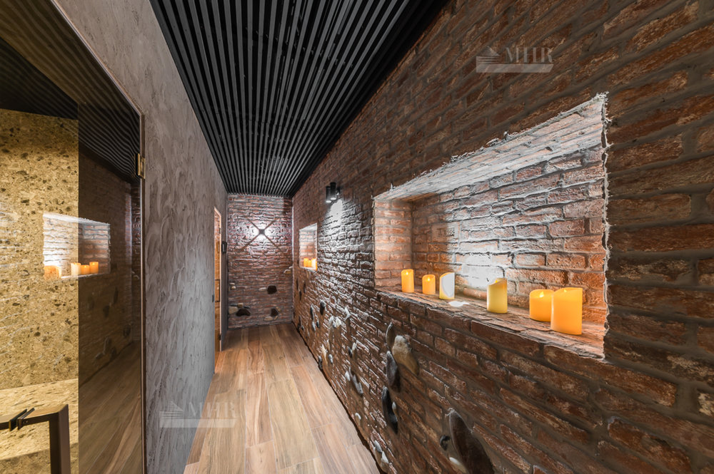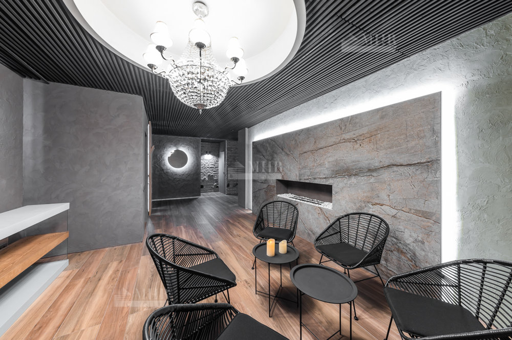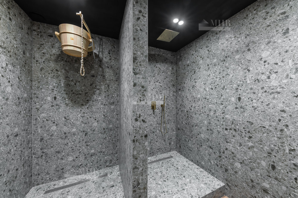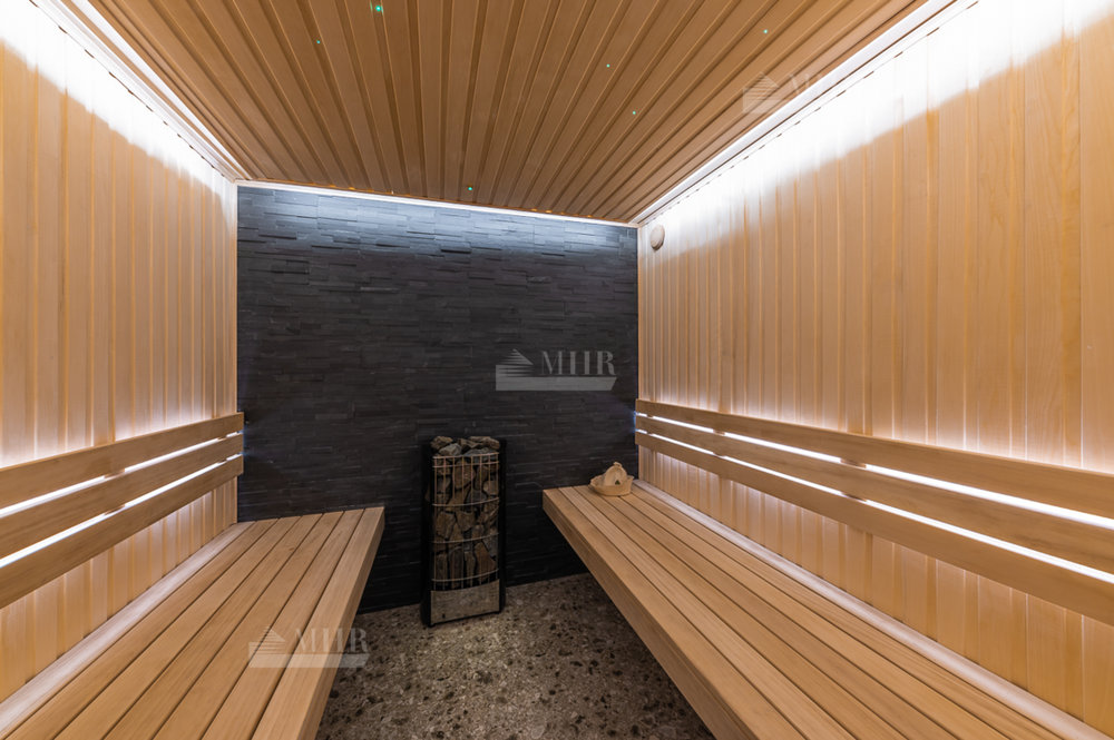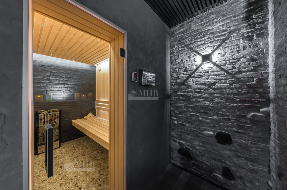SPA зона - сауна (установлено оборудование HARVIA, в том числе Звёздное небо), хаммам, душевые с обливным устройством SAWO, комната отдыха с биокамином и роскошной Итальянской люстрой, санузел.