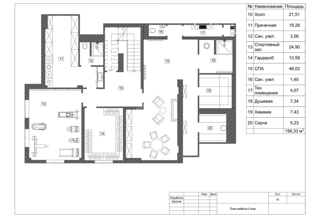 Технологическая часть: две комнаты свободного назначения с дневным освещением (спортивный зал, комната для персонала и тд.), прачечная, санузел.