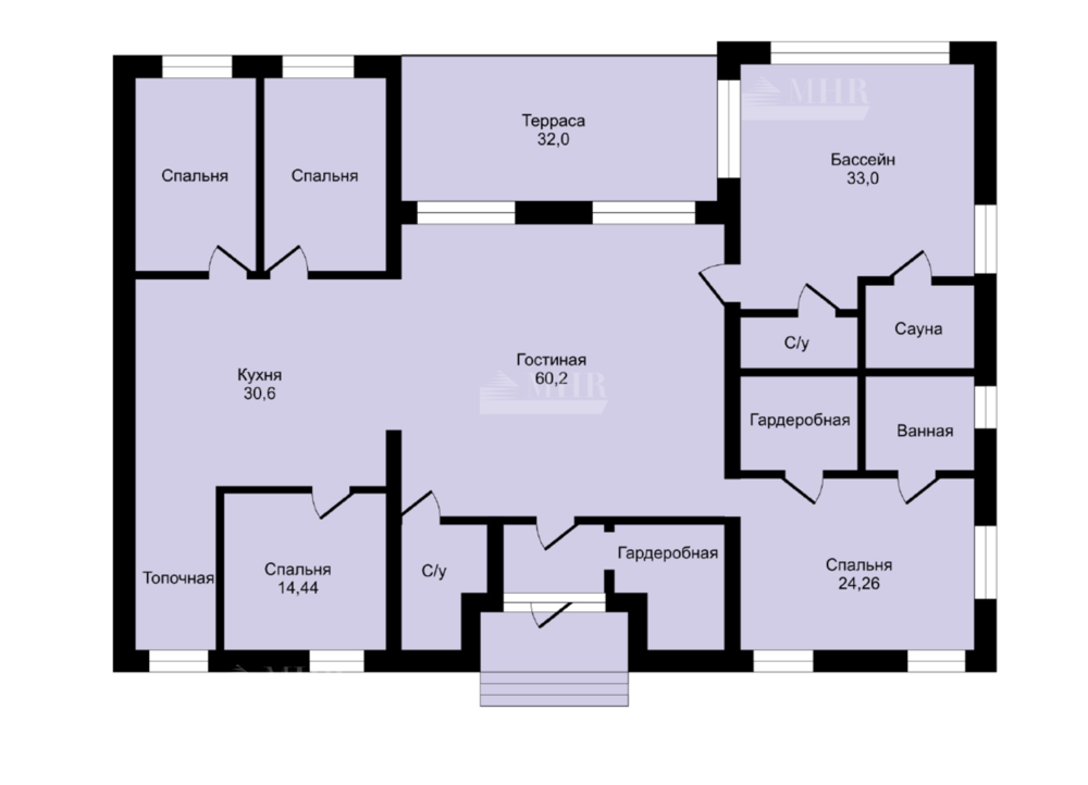 Планировка: холл, гостиная с выходом на террасу, гардеробная, с/у, 3 спальни с выходом на кухню, СПА-зона: бассейн, сауна, гардеробная, ванная с с/у с выходом в комнату отдыха.