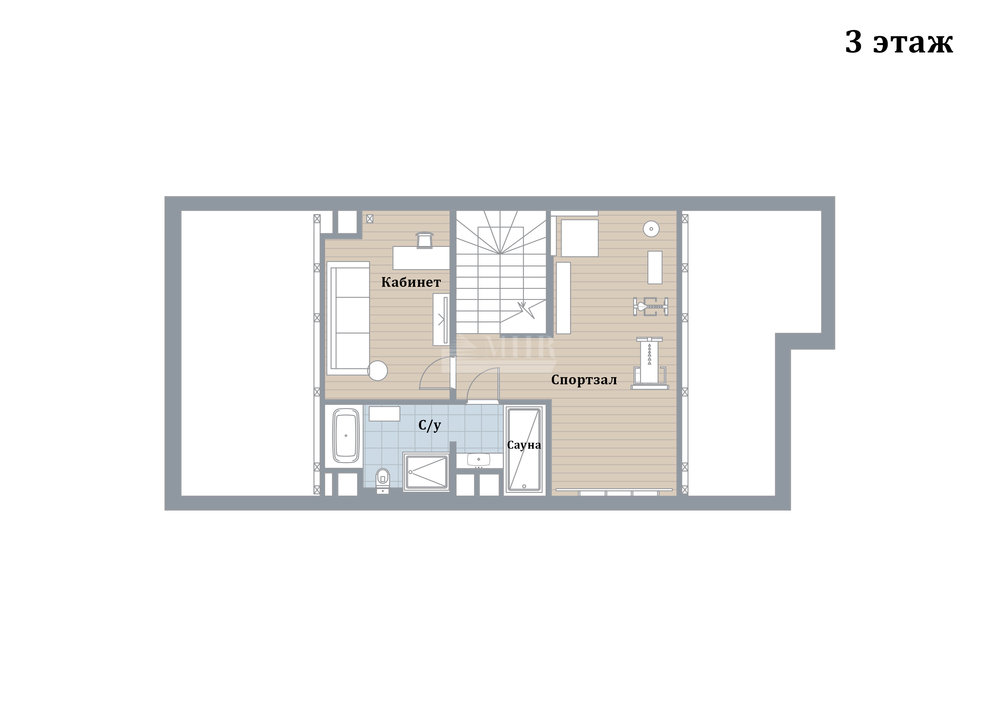 3 этаж: спортзал, кабинет, с/у, сауна.